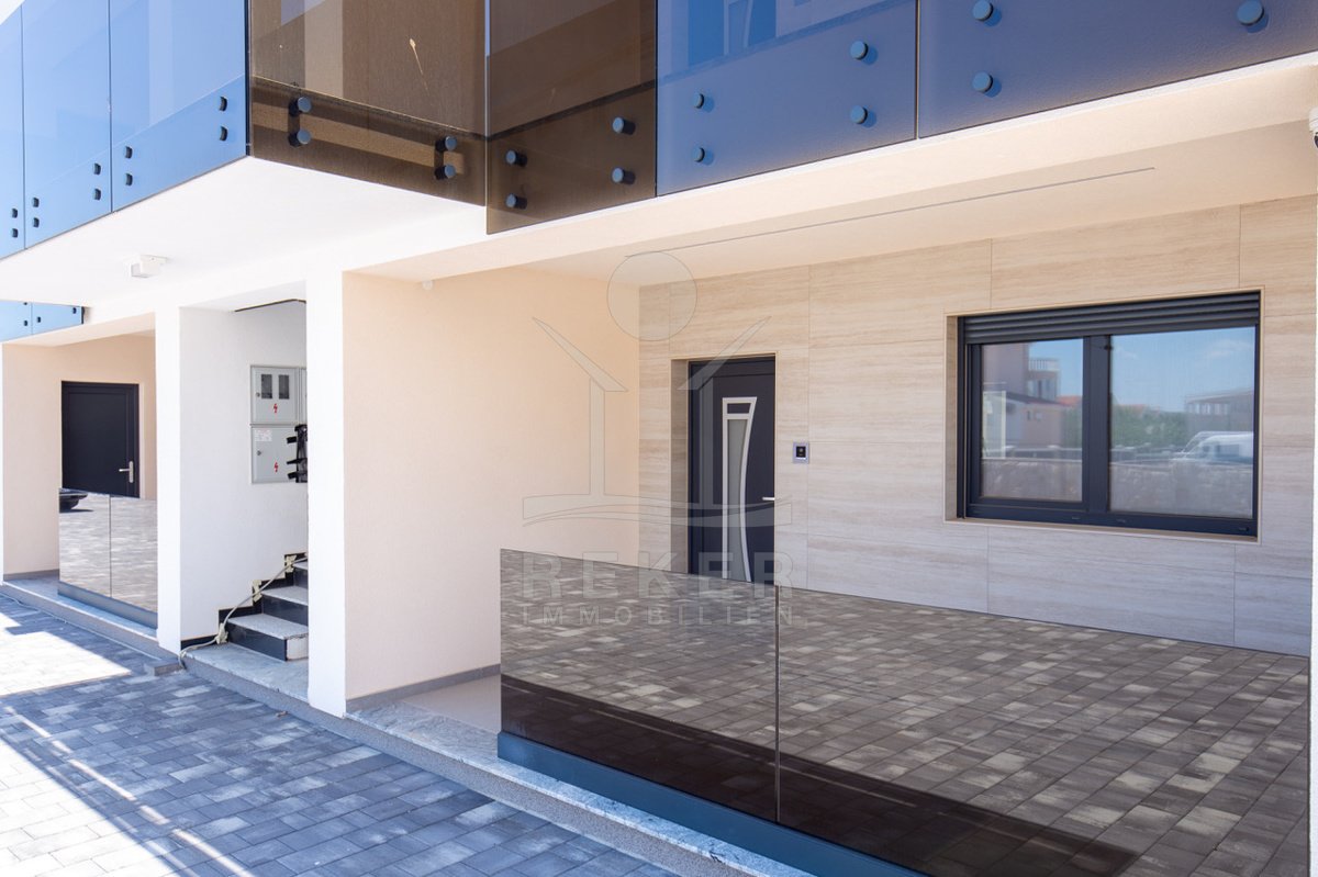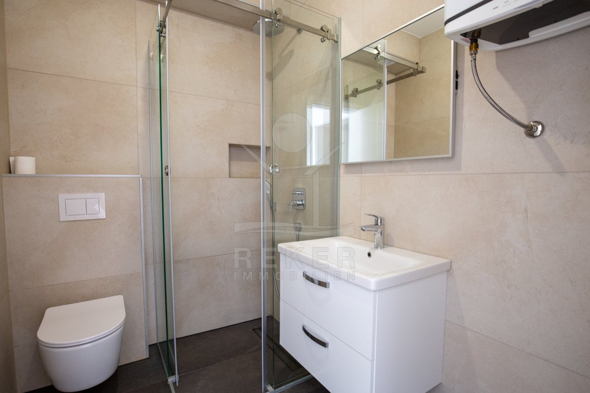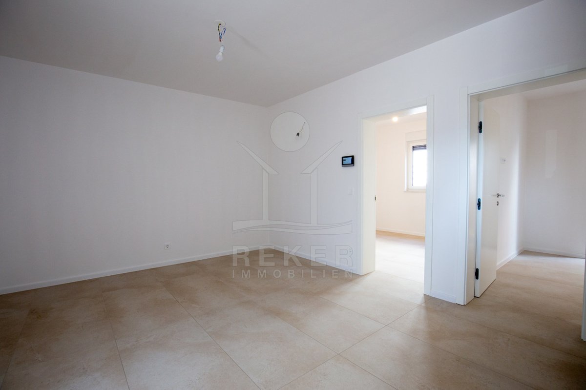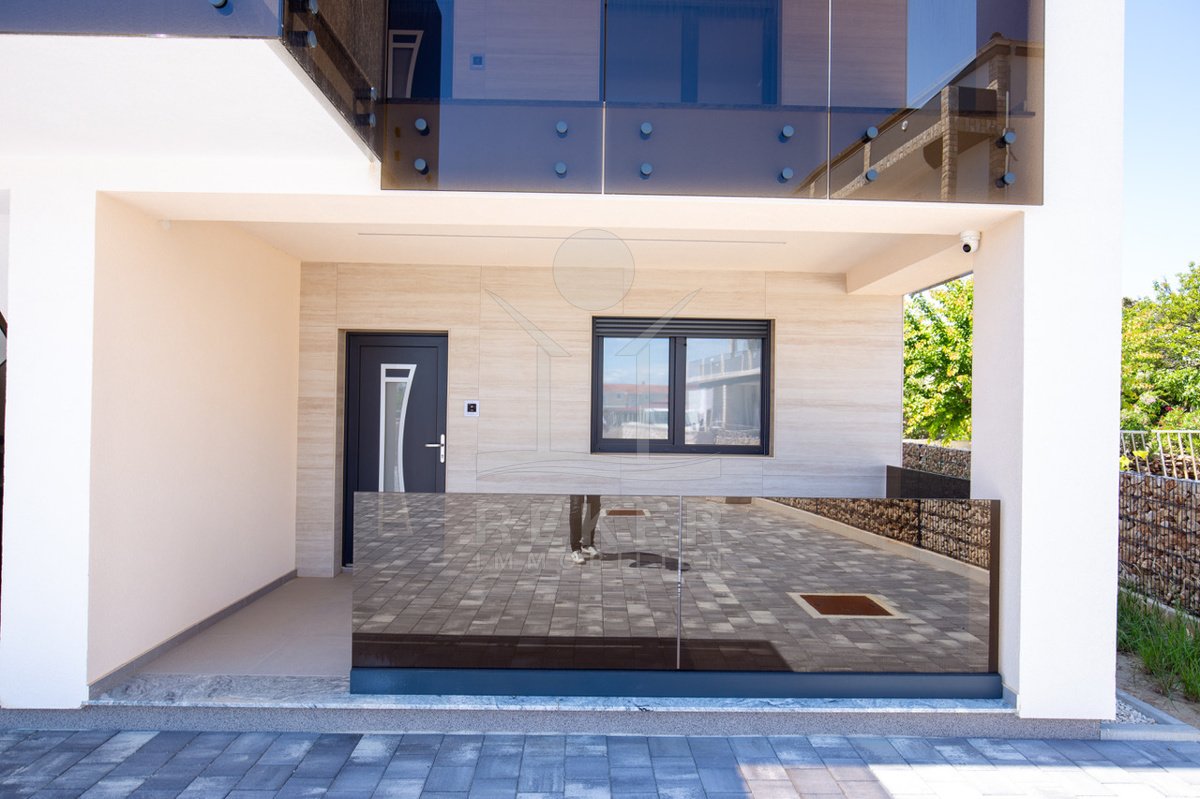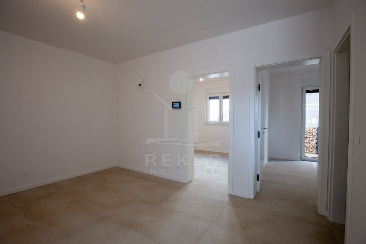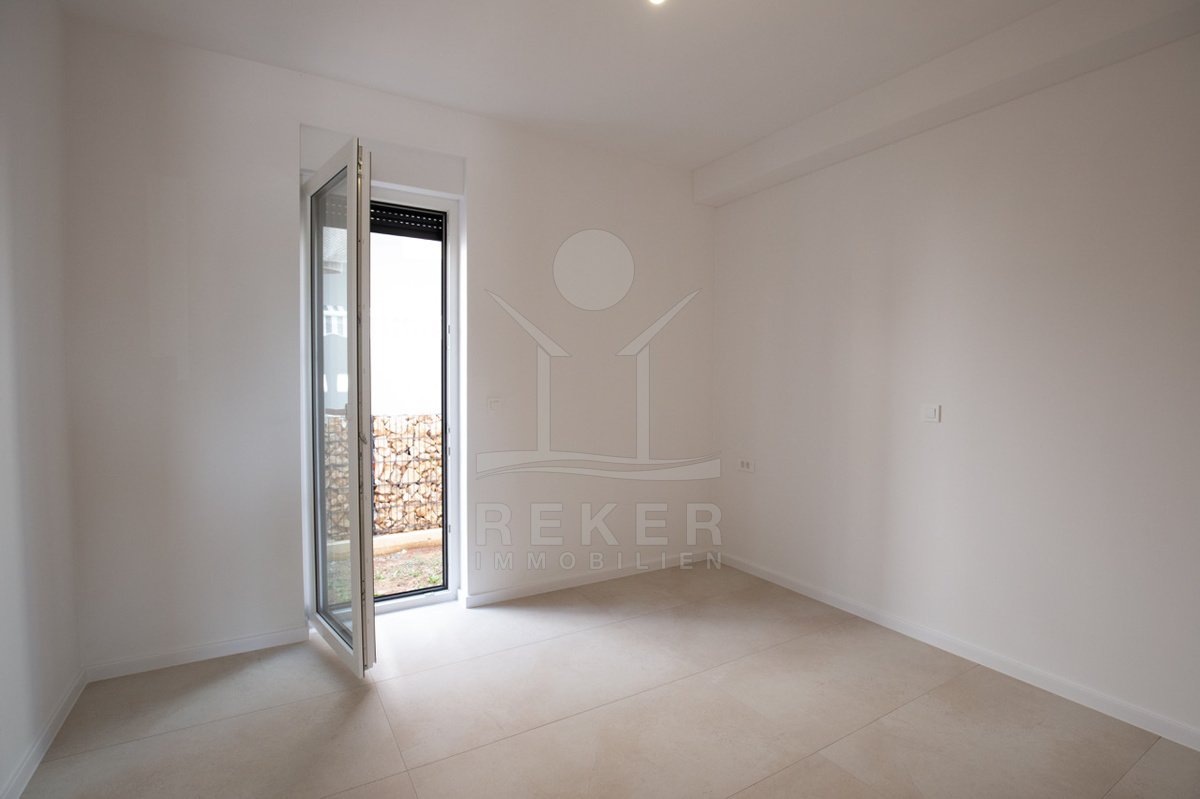 In der Stadt Vir, auf der gleichnamigen Insel, wohnen Sie hier ruhig, aber nie abgeschieden. Alles, was man im Alltag braucht, ist gut erreichbar. Die Umgebung ist gepflegt, modern bebaut und frei von Durchgangsverkehr. Ein paar Schritte genügen – und Sie stehen am Strand. Das Gebäude wurde 2025 fertiggestellt und überzeugt mit klarer, moderner Architektur. Insgesamt sechs Wohnungen verteilen sich auf zwei Etagen, je drei unten und oben. Jede Wohnung hat ihren eigenen Zugang. Vor dem Haus sind gepflasterte Flächen und für jede Wohnung ein eigener Parkplatz. Oben laden große Balkone mit Glasbrüstung zum Draußensitzen ein, unten gibt es überdachte Terrassen.