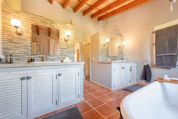 Das zweite Haus besitzt eine gültige ETV-Lizenz für 12 Gäste und bietet ein Wohn- und Esszimmer mit Küche sowie sechs Schlafzimmer mit eigenem Bad. Beide Häuser öffnen sich zum Garten und zum Poolbereich – ideal zum Entspannen oder für Gäste.
