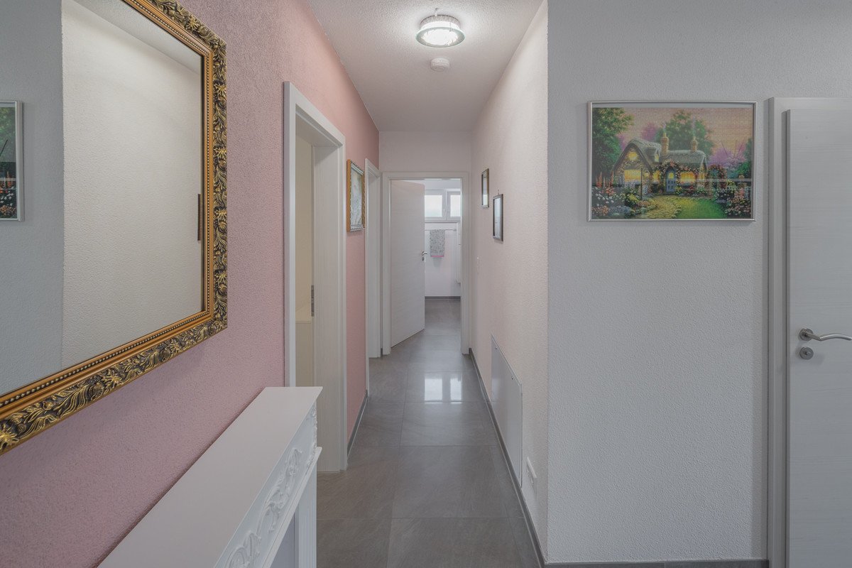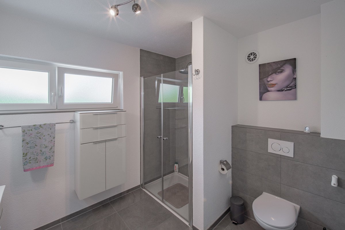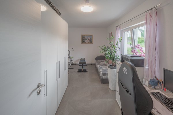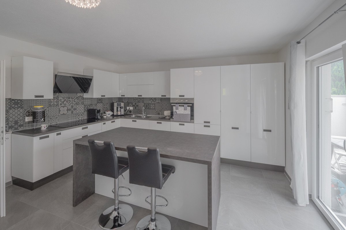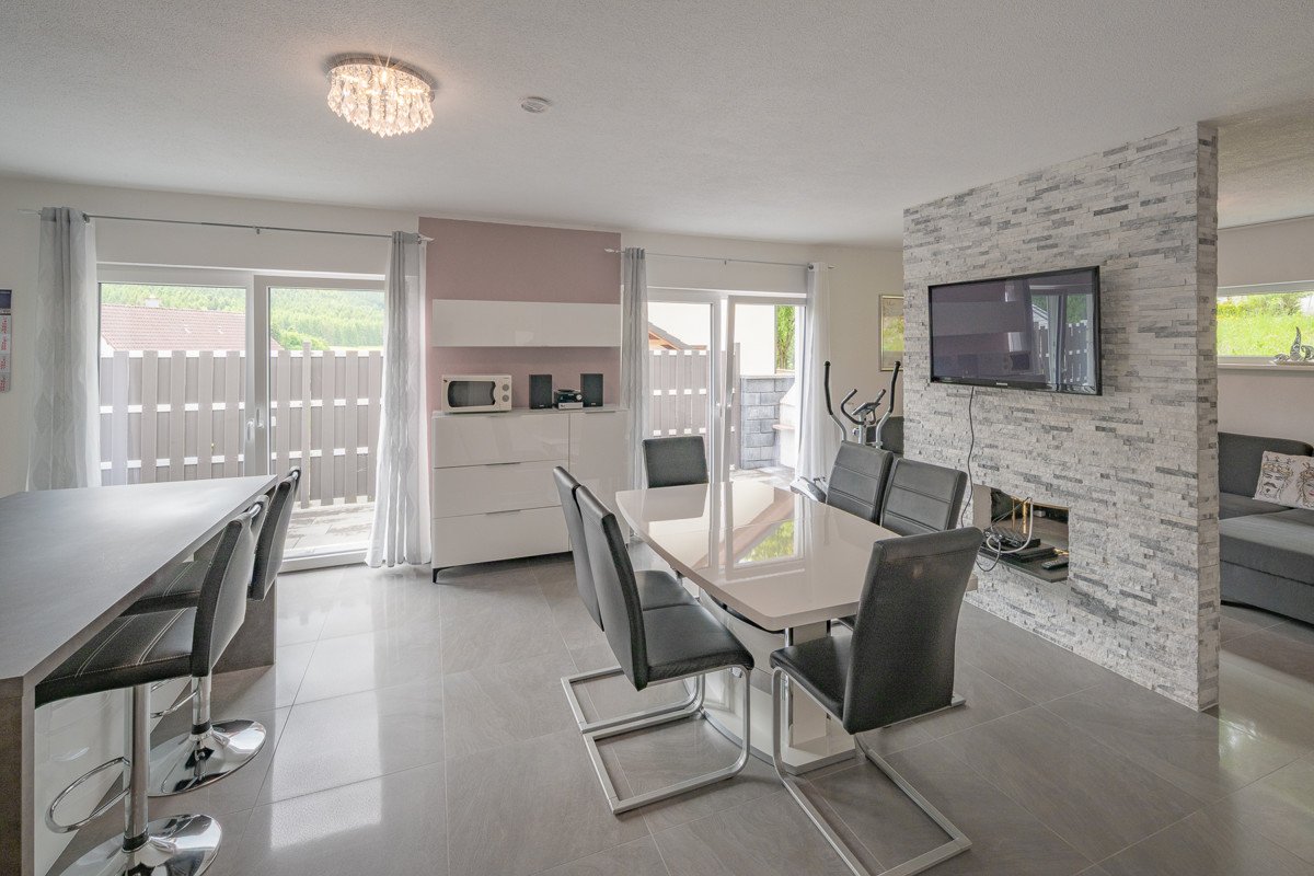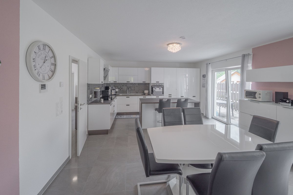 Mit insgesamt 5 Zimmern ist das Haus hochwertig ausgebaut. Der zentrale Wohn- und Essbereich bildet das Herzstück des Hauses, in dem die ganze Familie gerne zusammenkommt. Die offene Küche mit Essplatz und Wohnzimmer grenzt direkt an diesen Bereich an. Eine hochwertige Einbauküche sowie zwei Tageslichtbäder und ein großer Hauswirtschaftsraum ergänzen das moderne Wohnkonzept.