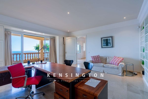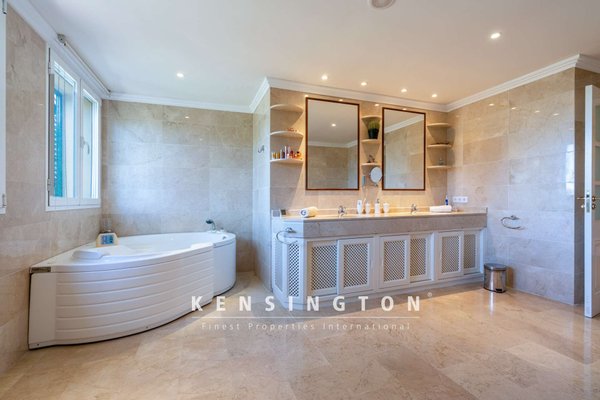 Vorbei am Poolbereich mit Sonnenliegen gelangt man auf eine elegante, überdachte Terrasse, die zum Verweilen und Genießen des rundum blaufunkelnden Meeres einlädt. Bereits beim Betreten des hellen, repräsentativen Entrées spürt man das großzügige Raumgefühl. Eine Schiebetür öffnet sich zum weitläufigen Wohnbereich mit langem Esstisch, an dem Familie und Gäste Platz finden. Die Küche mit Kochinsel ist hochwertig ausgestattet, ein praktischer Hauswirtschaftsraum ist geschickt hinter einer Schranktür verborgen. Die gemütliche Sofalandschaft mit Kamin lädt zum entspannten Beisammensein ein. Von jedem Raum dieser Etage aus gelangt man auf eine der überdachten Terrassen.