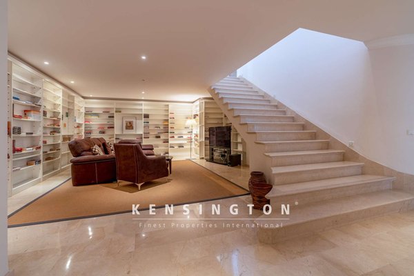 Vom Eingangsbereich aus erreicht man zudem ein helles Arbeitszimmer (optional als zusätzliches Schlafzimmer nutzbar) sowie ein Gäste-Duschbad. Eine Treppe führt hinunter in das Lese-/TV-Zimmer mit besonderem Wohlfühlambiente. Auf dieser Ebene befinden sich außerdem drei geräumige Schlafzimmer mit Bädern en suite sowie ein Ankleideraum. Jedes Zimmer verfügt über einen privaten Balkon und bietet – wie auch das obere Stockwerk – einen inspirierenden Blick ins Grüne. Die 62 m² große Garage auf dieser Etage bietet viel Stauraum.