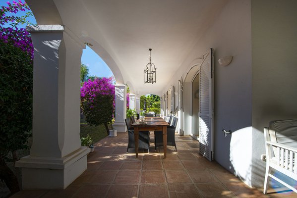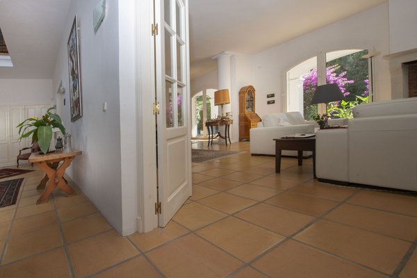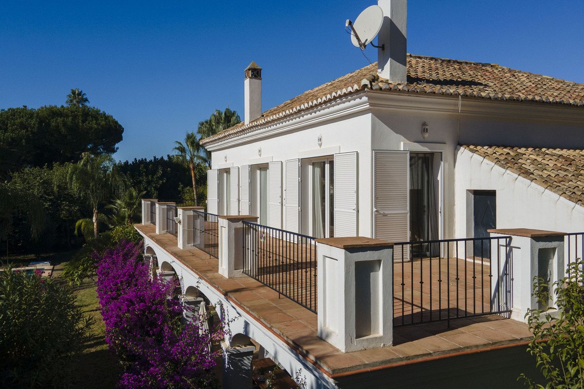 This charming detached villa is located in the sought-after, peaceful neighborhood of Guadalmina Baja, a renowned residential area on the Costa del Sol. Built in 2004 to high German quality and safety standards, it offers a timeless combination of elegance and classic design. Upon arrival, you are greeted by a beautiful Andalusian-style patio with a fountain, leading into the entrance hall, where you'll find an elegant staircase. The spacious living room, measuring around 70 square meters, offers abundant natural light and features high ceilings. It includes a separate dining area and opens onto south- and west-facing terraces that are partially covered. These terraces overlook a beautifully maintained tropical garden and a large pool area. The property sits on a well-maintained 2,430-square-meter plot, offering a private and tranquil environment, ideal for relaxation and family life, within walking distance to the beach. In general Guadalmina Baja offers a peaceful and upscale lifestyle, combining privacy with convenience. Residents enjoy lush surroundings, easy access to the beach, and nearby golf courses. With excellent restaurants, shops, and schools close by, it provides a sophisticated yet tranquil setting for comfortable living.