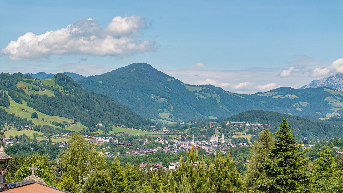 Von dieser Ebene hat man vollen Blick auf den Hahnenkamm, den gesamten Wilden Kaiser und die Bichlalm.