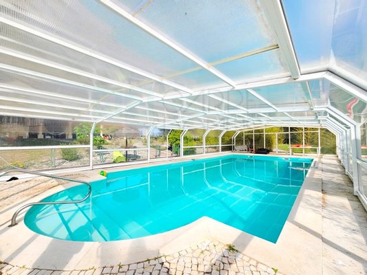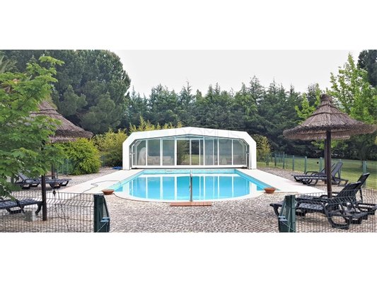 Angenehmer und entspannender Außenbereich mit weitläufigem Garten mit einigen Bäumen und Spielplatz. Freuen Sie sich auf einen Pool mit Außenbedeckung und Support-Spas. Es hat auch eine überdachte Garage von 55m2, für bis zu 4 Autos; und Zwinger. Es hat ein Wasserloch.