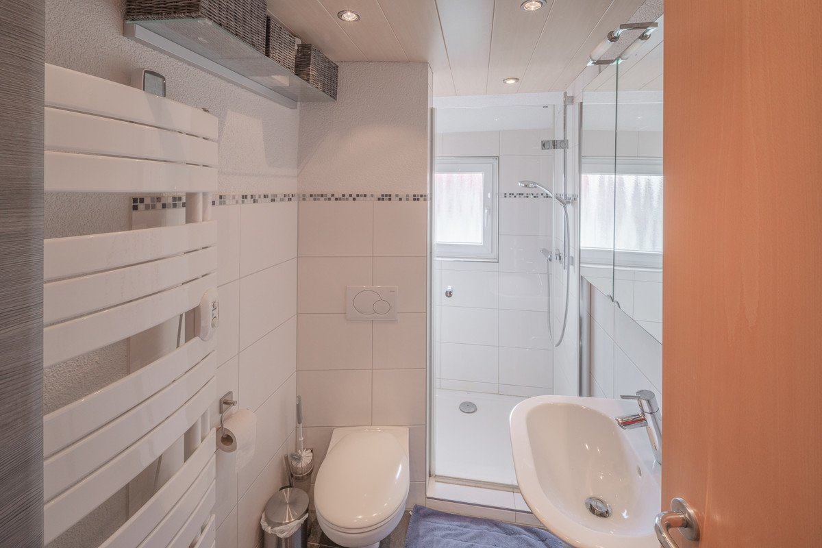 Das zeitlose Tageslichtbad ist mit einer bodentiefen Dusche, einem Waschbecken, einem WC und einem Waschmaschinenanschluss ausgestattet. Die Kunststofffenster und die Elektrik wurden 2010/2011 erneuert. Die Wohnung verfügt teilweise über eingelassene Beleuchtung.