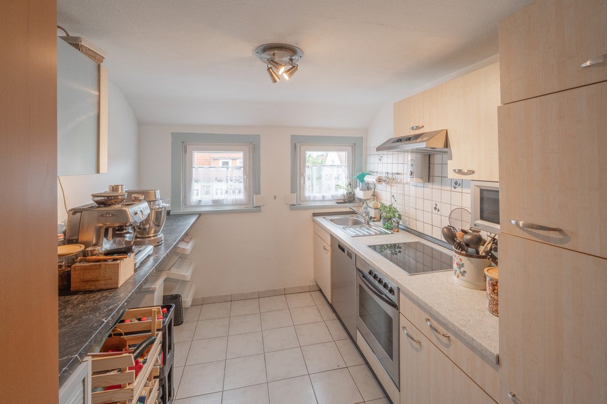 Eine Küche mit Einbauküche ist ebenfalls vorhanden.