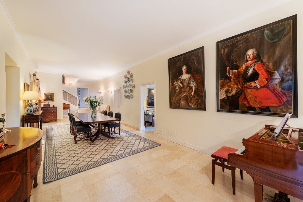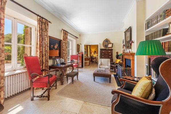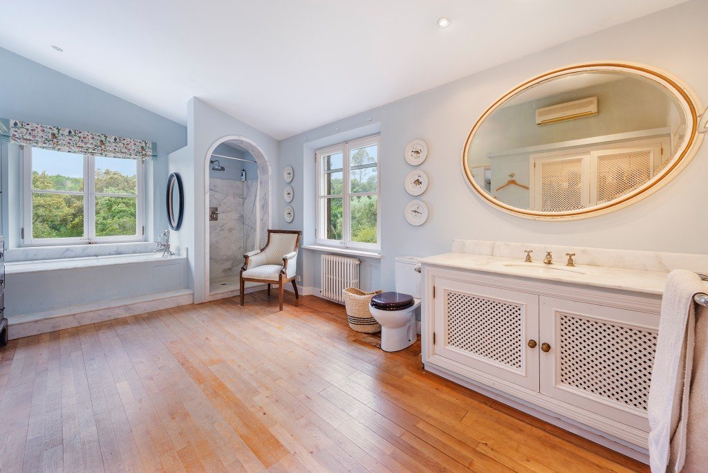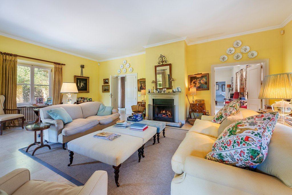 Die Innenräume bieten raffinierten Komfort mit hohen Decken, großen Fenstern und traditionellen Materialien wie Stein und Marmor. Im Erdgeschoss befinden sich zwei elegante Salons mit Kaminen, ein Winteresszimmer, ein Heimbüro/Bibliothek, ein zusätzliches Schlafzimmer und Badezimmer (derzeit als Spielzimmer genutzt), zwei Gästetoiletten, ein sicherer Tresorraum und eine renovierte Küche mit einem Aga-Herd und Miele-Geräten sowie eine separate Speisekammer und Waschküche.