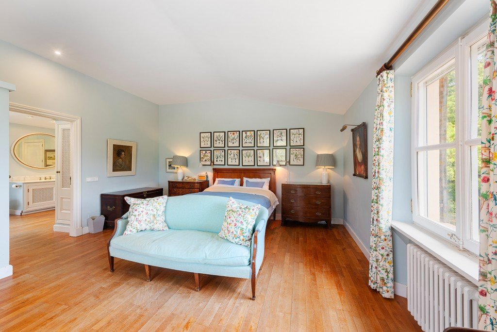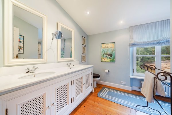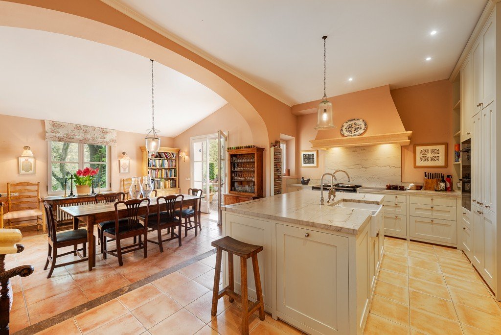 Die Innenräume bieten raffinierten Komfort mit hohen Decken, großen Fenstern und traditionellen Materialien wie Stein und Marmor. Im Erdgeschoss befinden sich zwei elegante Salons mit Kaminen, ein Winteresszimmer, ein Heimbüro/Bibliothek, ein zusätzliches Schlafzimmer und Badezimmer (derzeit als Spielzimmer genutzt), zwei Gästetoiletten, ein sicherer Tresorraum und eine renovierte Küche mit einem Aga-Herd und Miele-Geräten sowie eine separate Speisekammer und Waschküche.