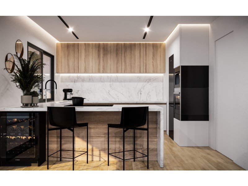 Auf der unteren Ebene finden Sie eine Doppelgarage, einen Fitnessbereich, eine Waschküche, einen Technikraum, ein zusätzliches Badezimmer und einen vielseitigen Raum, der sich ideal für einen Weinkeller oder eine Mehrzwecknutzung eignet.