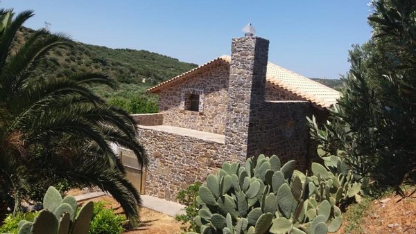 Das Steinhaus ist 75 m² groß und steht auf einem 5.800 m² großen Grundstück. Das Haus besteht aus einem offenen Bereich mit Wohnküche und Kamin, einem sehr großen Torbogen und einem großen Raum mit sehr hoher Decke. Es besteht auch die Möglichkeit, ein 40 m² großes Loft mit einer Tür zum Balkon im ersten Stock zu bauen, von dem aus man die Aussicht auf die Berge und Olivenbäume genießen kann. Im Erdgeschoss gibt es auch ein Badezimmer und einen kleinen Abstellraum von 8 m². Das Haus muss fertiggestellt werden. Es hat eine gute Zufahrt und verfügt derzeit nicht über Strom. Schließlich liegt es nur 5 km vom Meer entfernt.