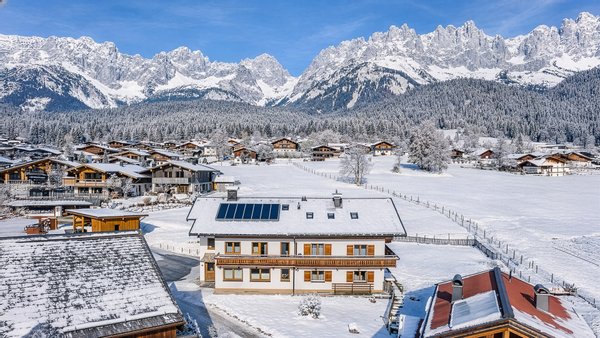 Das Objekt grenzt direkt an Grundland und der Blick geht ungehindert auf den Wilden Kaiser, das Kitzbüheler Horn bis hin zu den Loferer Steinberge.