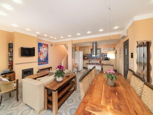 Der Hauptwohnbereich besticht durch einen großzügigen, offenen Grundriss und umfasst ein gemütliches Wohnzimmer mit Kamin, einen Essbereich und eine moderne, voll ausgestattete Küche.