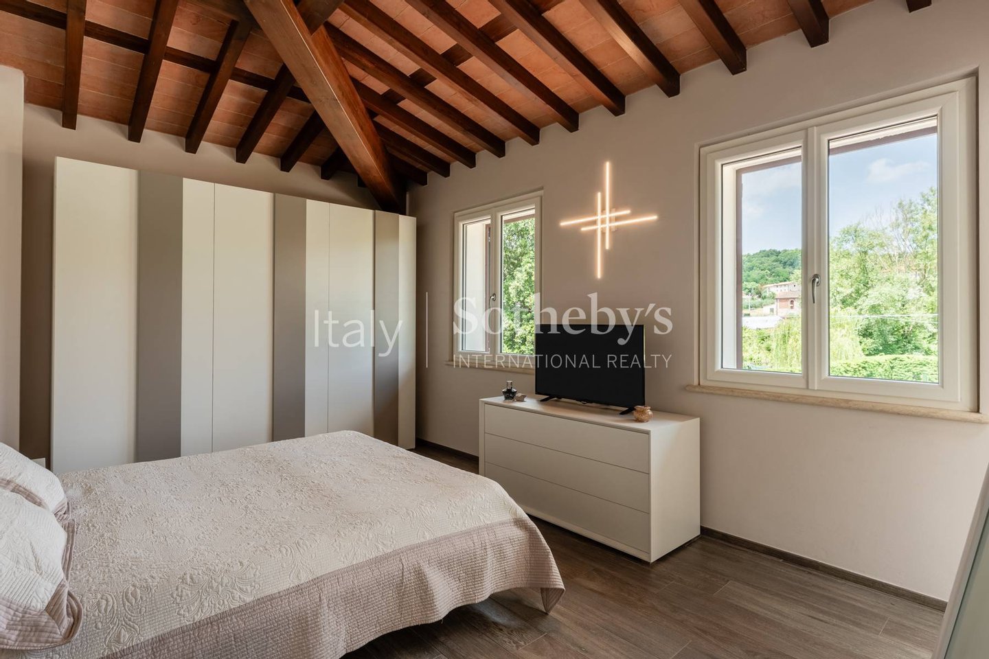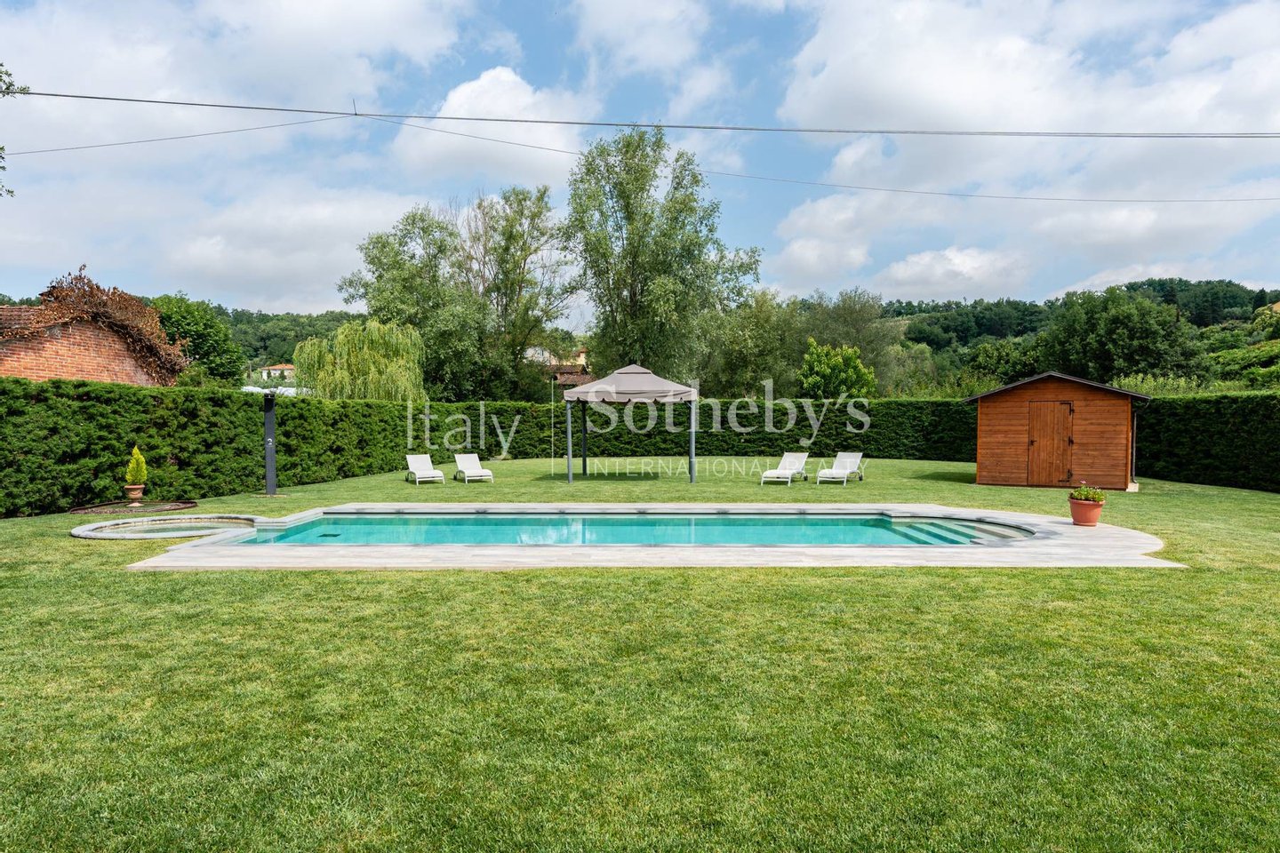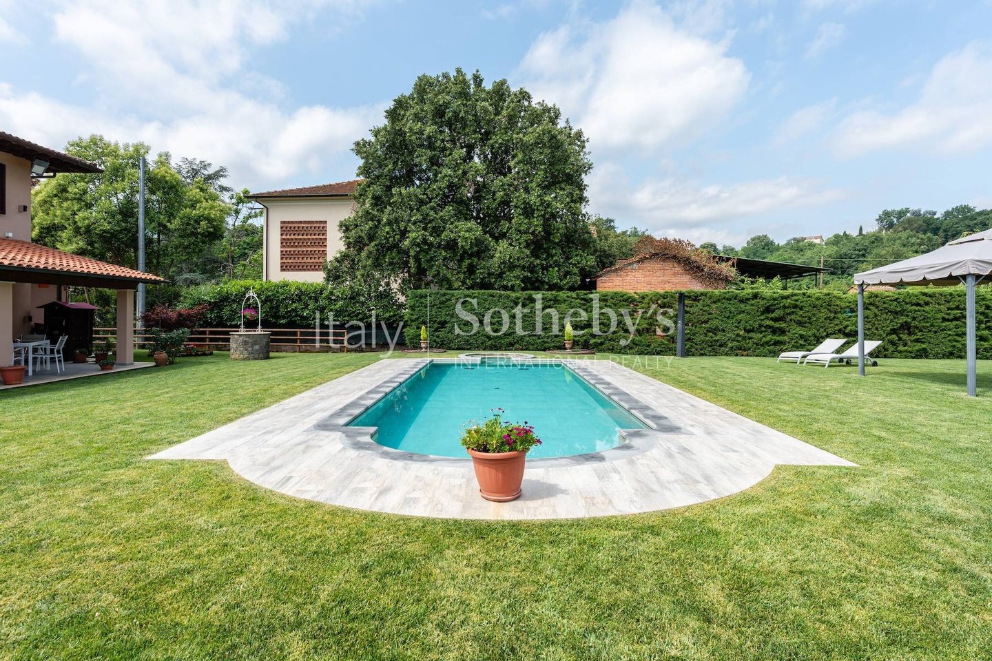 Eingebettet in die Ruhe der Hügel südöstlich von Lucca, nur 15 Minuten vom historischen Stadtzentrum entfernt, stellt diese elegante, freistehende Villa eine perfekte Verbindung aus zeitgenössischer Eleganz und dem Zauber der toskanischen Natur dar.