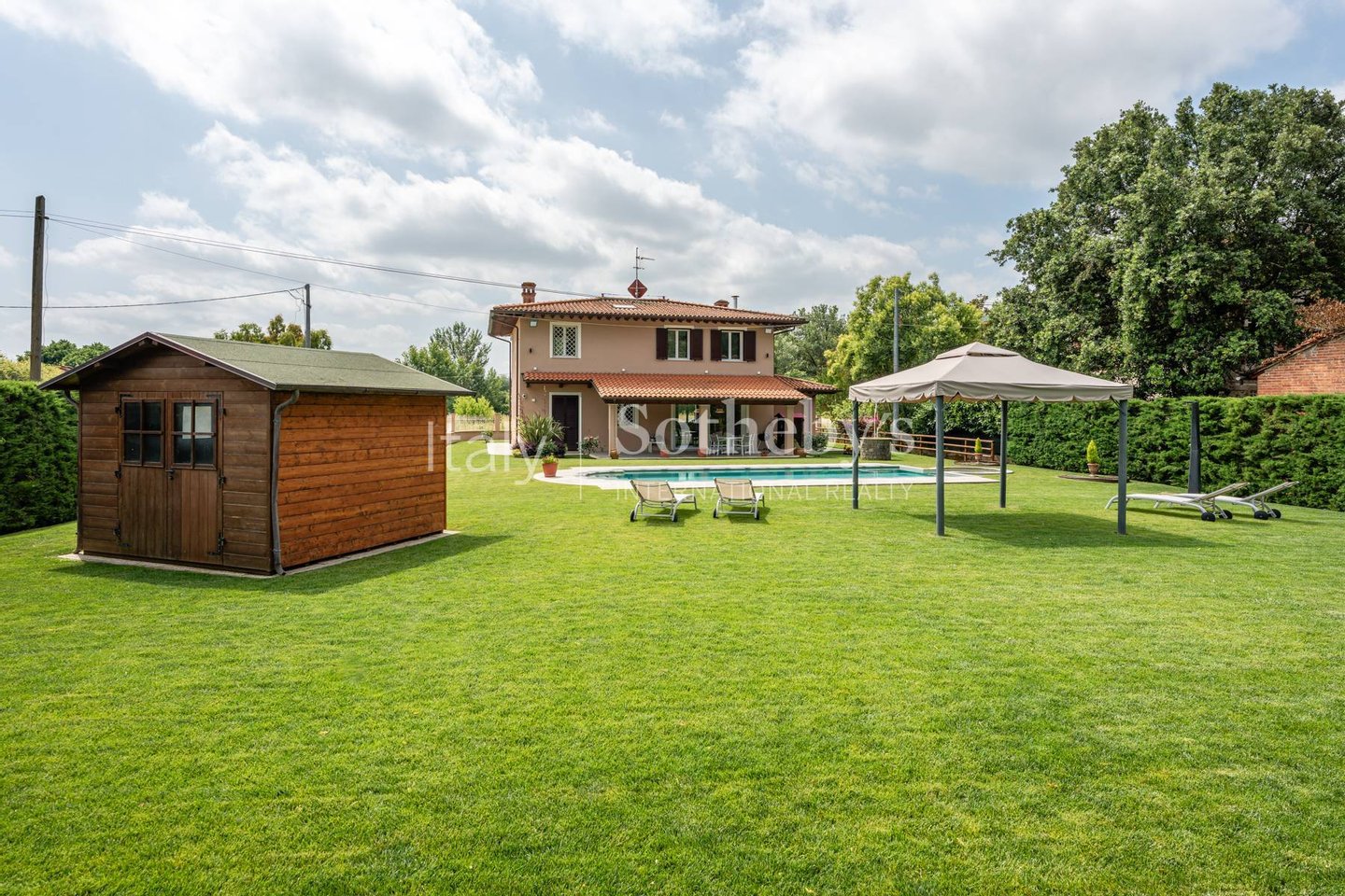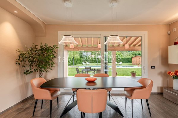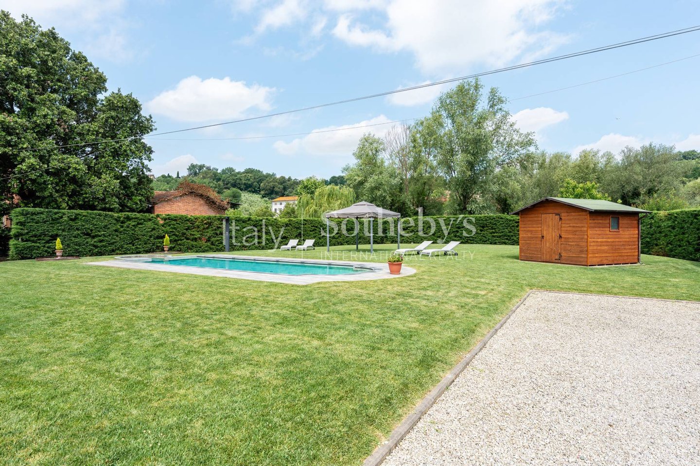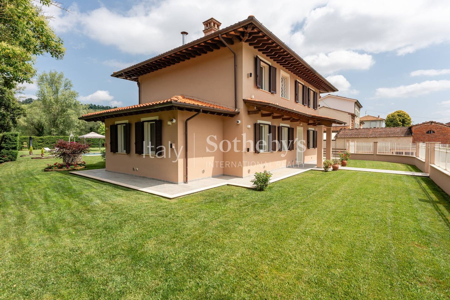 Eingebettet in die Ruhe der Hügel südöstlich von Lucca, nur 15 Minuten vom historischen Stadtzentrum entfernt, stellt diese elegante, freistehende Villa eine perfekte Verbindung aus zeitgenössischer Eleganz und dem Zauber der toskanischen Natur dar.Die