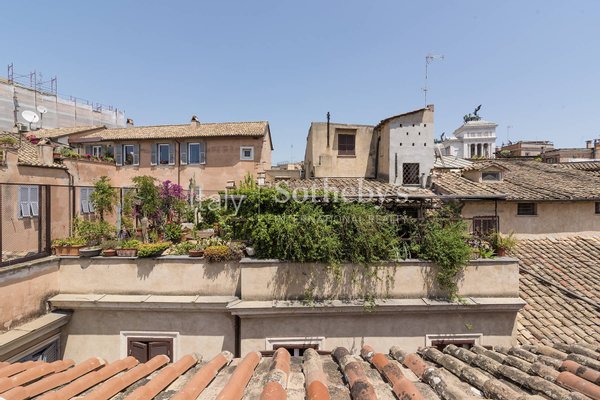 Im obersten Stockwerk führt eine Treppe zu einer privaten Dachterrasse mit außergewöhnlichem Blick über die Dächer Roms - ein einzigartiges Panorama, das die Magie der Altstadt einfängt. Ein perfekter Ort, um den Sonnenuntergang zu genießen oder Rom aus einer privilegierten Perspektive zu erleben.