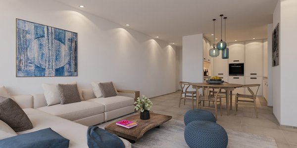 Beim Eintreten empfängt Sie ein beeindruckender Wohn- und Essbereich, der durch seine Offenheit und klare Formsprache sofort ein Gefühl von Freiheit und Großzügigkeit vermittelt. Die fließende Raumgestaltung lädt zum Verweilen ein – ob bei einem Glas Wein am Abend oder bei geselligen Runden mit Gästen. Die großflächigen Fenster öffnen sich zu zwei Terrassen mit Blick auf die grüne Umgebung und spektakuläre Sonnenuntergänge. Innen wie außen ist diese Wohnung ein Ort zum Leben und Genießen.