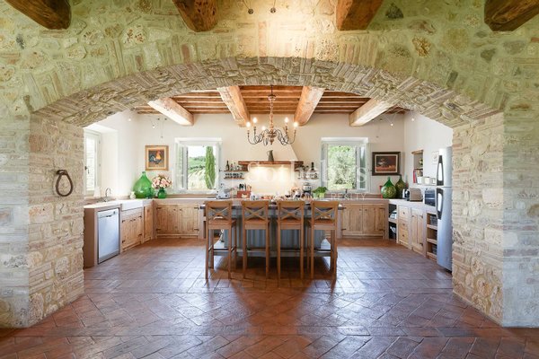 Ein imposanter Natursteinbogen trennt den Salon von der offenen Küche, die in Mauerwerk und Massivholz maßgefertigt wurde und mit einer zentralen Kochinsel zum geselligen Beisammensein einlädt.