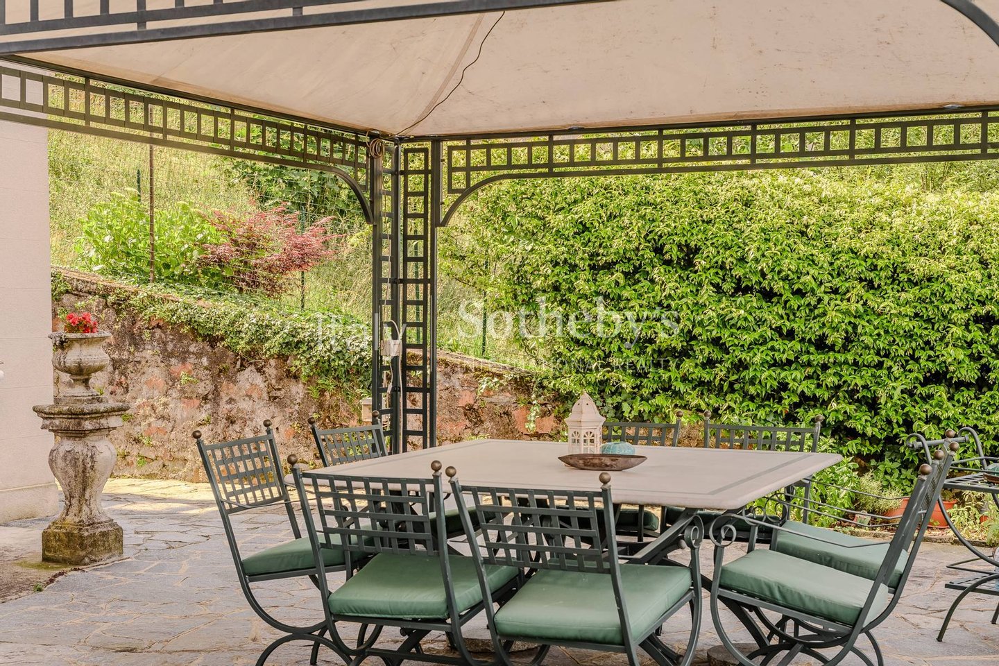 Das Anwesen besticht durch einen gepflegten italienischen Garten mit dekorativen Details: ein historischer Brunnen, zwei eindrucksvolle symmetrische Kieseltreppen und eine Vielzahl blühender Pflanzen, die dem Garten zu jeder Jahreszeit Farbe und Harmonie verleihen. Ein eleganter Pavillon aus Schmiedeeisen, direkt vor dem Wohnbereich gelegen, bietet einen geschützten und angenehmen Ort für gesellige Momente im Freien und entspannte Stunden.