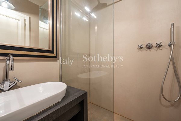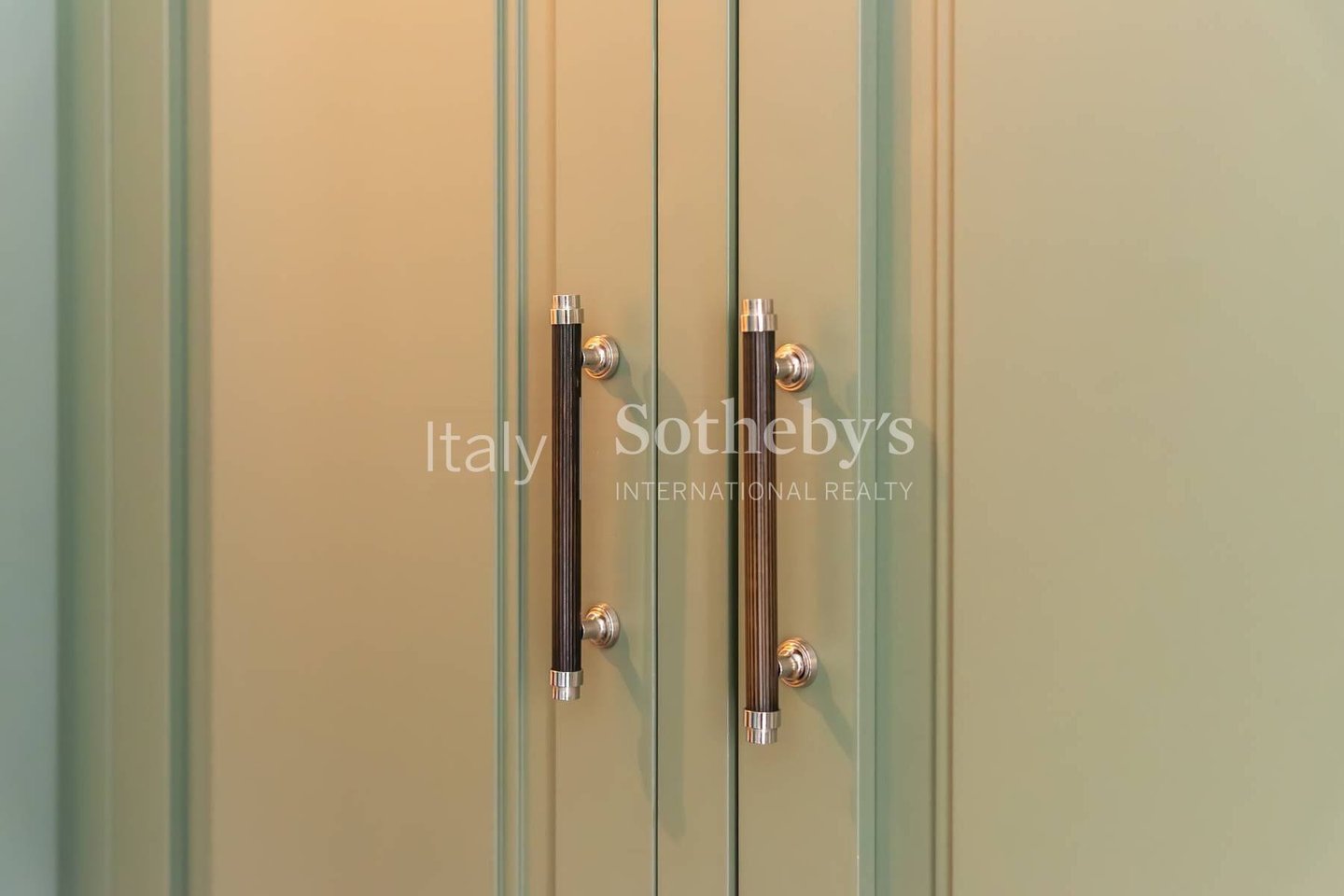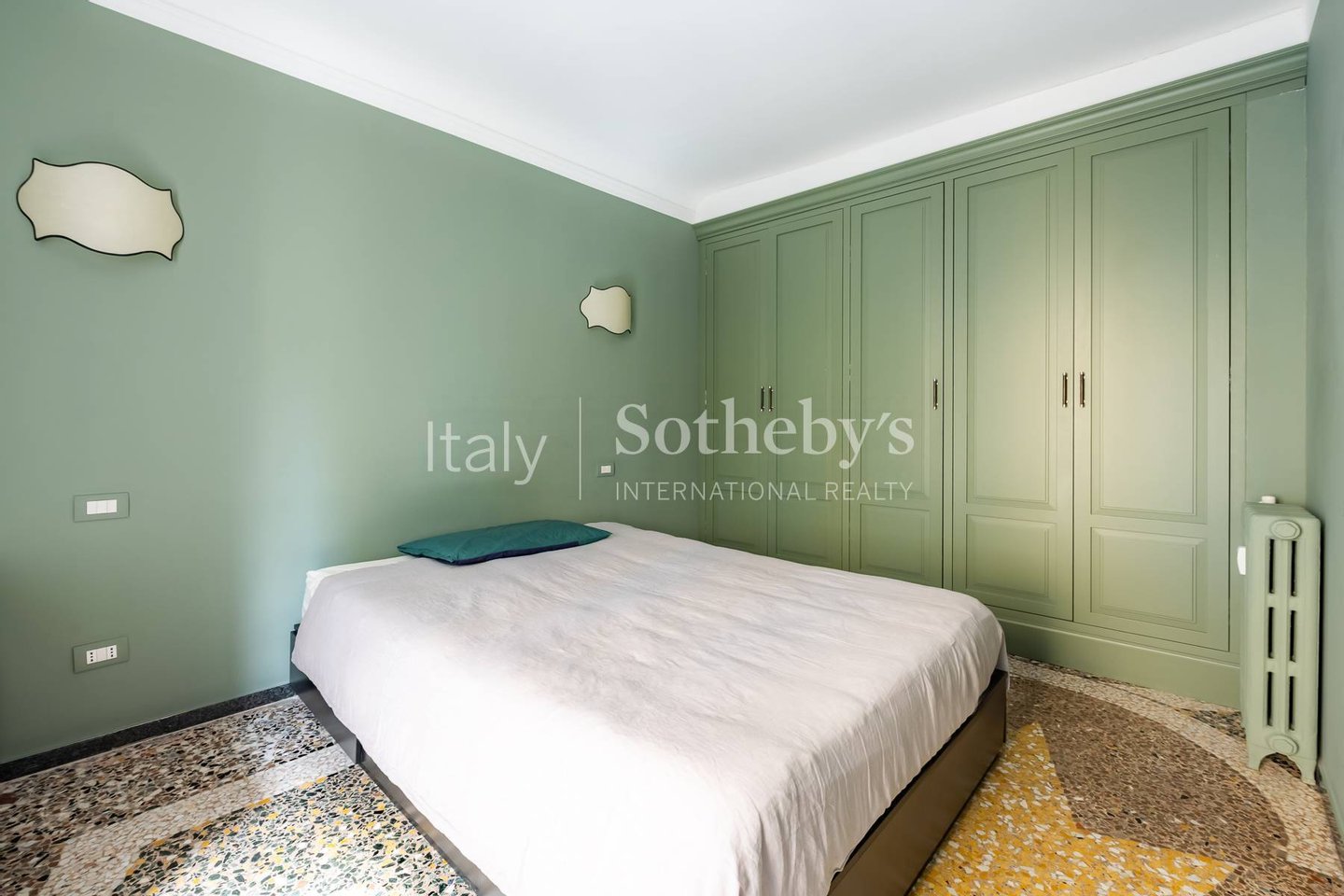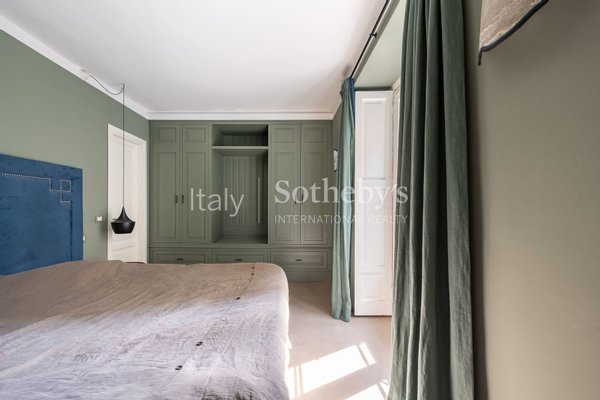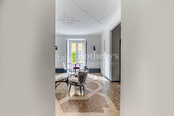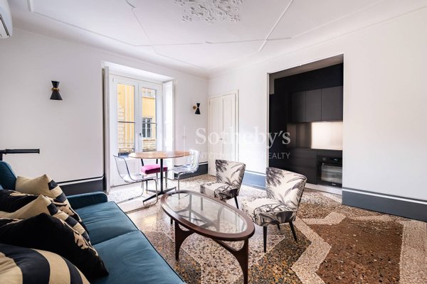 Der Raum dieser kleinen, eleganten Wohnung ist optimal genutzt - maßgefertigte Einbauschränke und Möbel in beiden Schlafzimmern sorgen für praktischen Stauraum. Hochwertige Materialien wie venezianischer Terrazzo-Boden und dekorative Stuckarbeiten an den Decken unterstreichen den stilvollen Charakter der Wohnung. Das Gebäude ist ein gepflegtes historisches Wohnhaus mit sehr gut erhaltenen Gemeinschaftsbereichen.