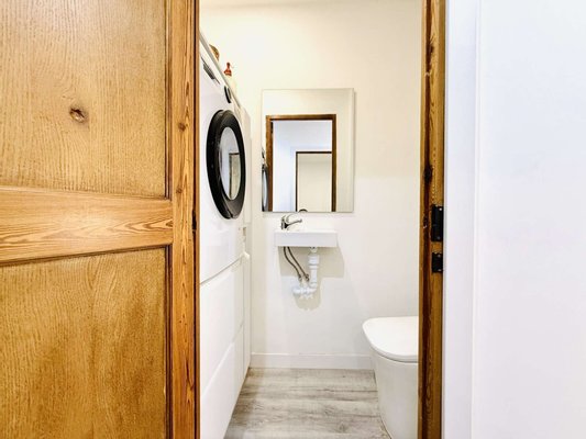 Die modern gestalteten Bäder überzeugen mit Dusche, WC und Waschbecken. Deckenspots und LED-Leisten in den Decken sorgen für eine wohlige Atmosphäre. Ein Gäste-WC mit Waschmaschine bietet zusätzlichen Komfort. Als Bodenbelag wurde hochwertiges Vinyl gewählt, das sowohl modern als auch pflegeleicht ist.
