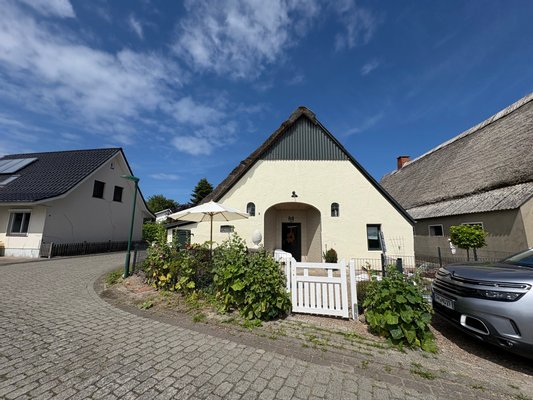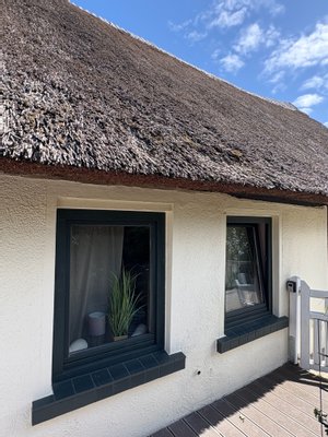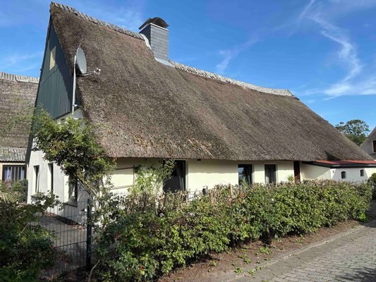 Die hauptsächlich sichtbare, zur Vorderseite zeigende Dachhälfte liegt unter Reet.