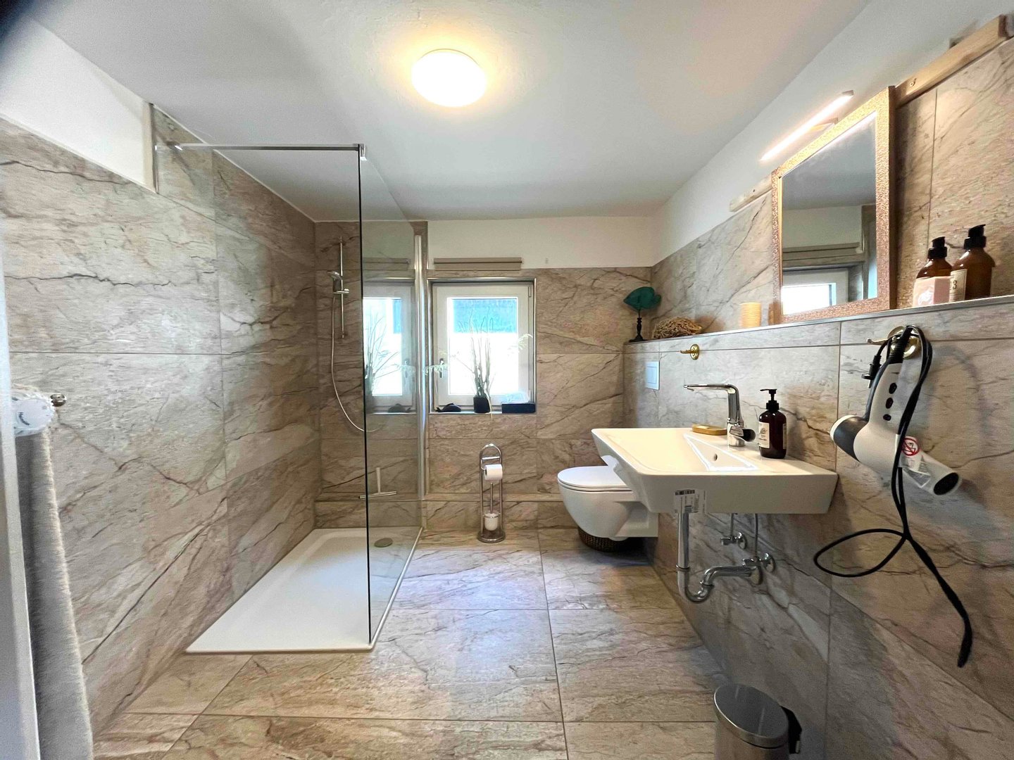 - Zwei hochwertige Badezimmer mit bodengleichen Duschen + spülrandlosen Hänge-WCs
