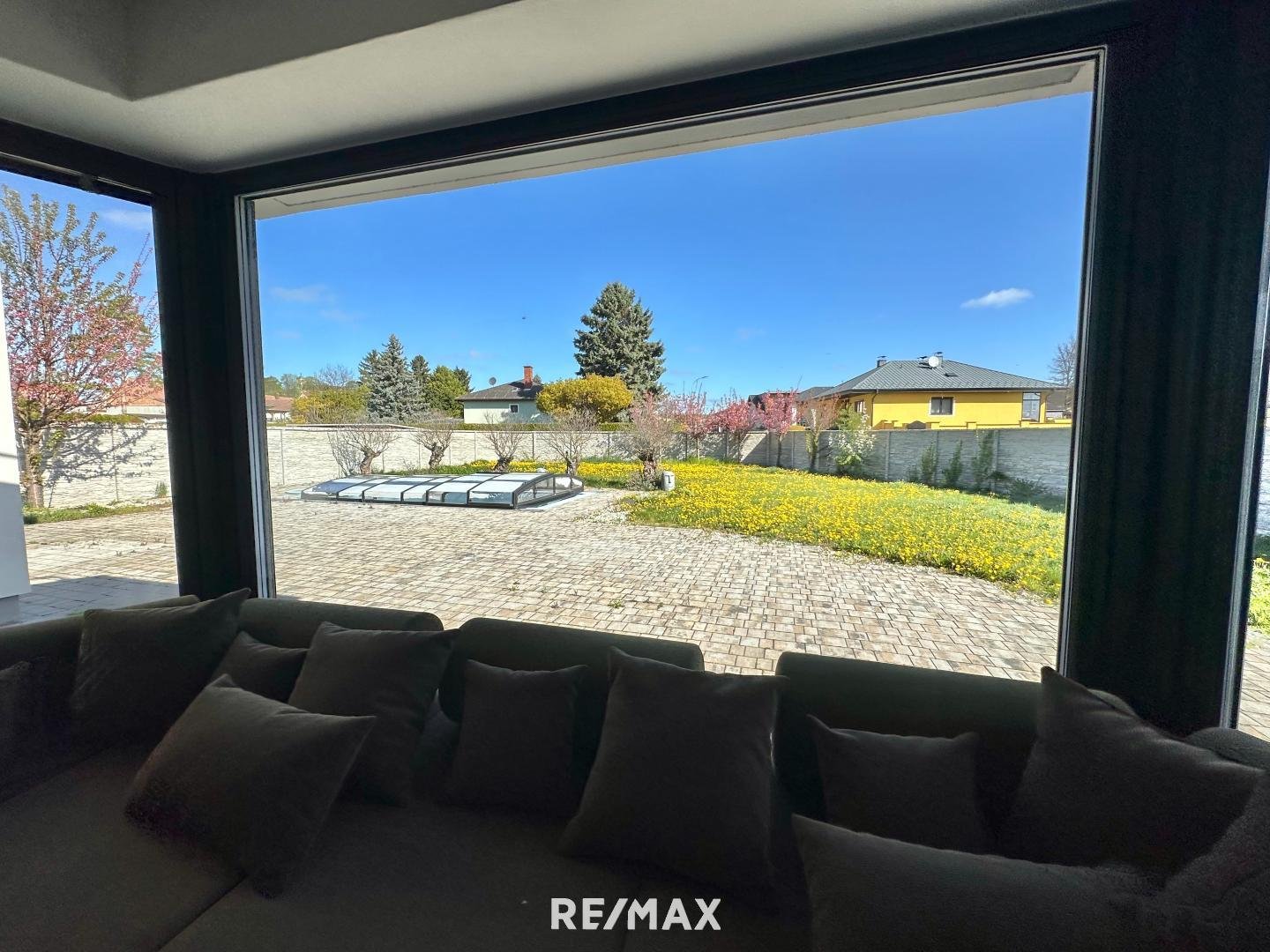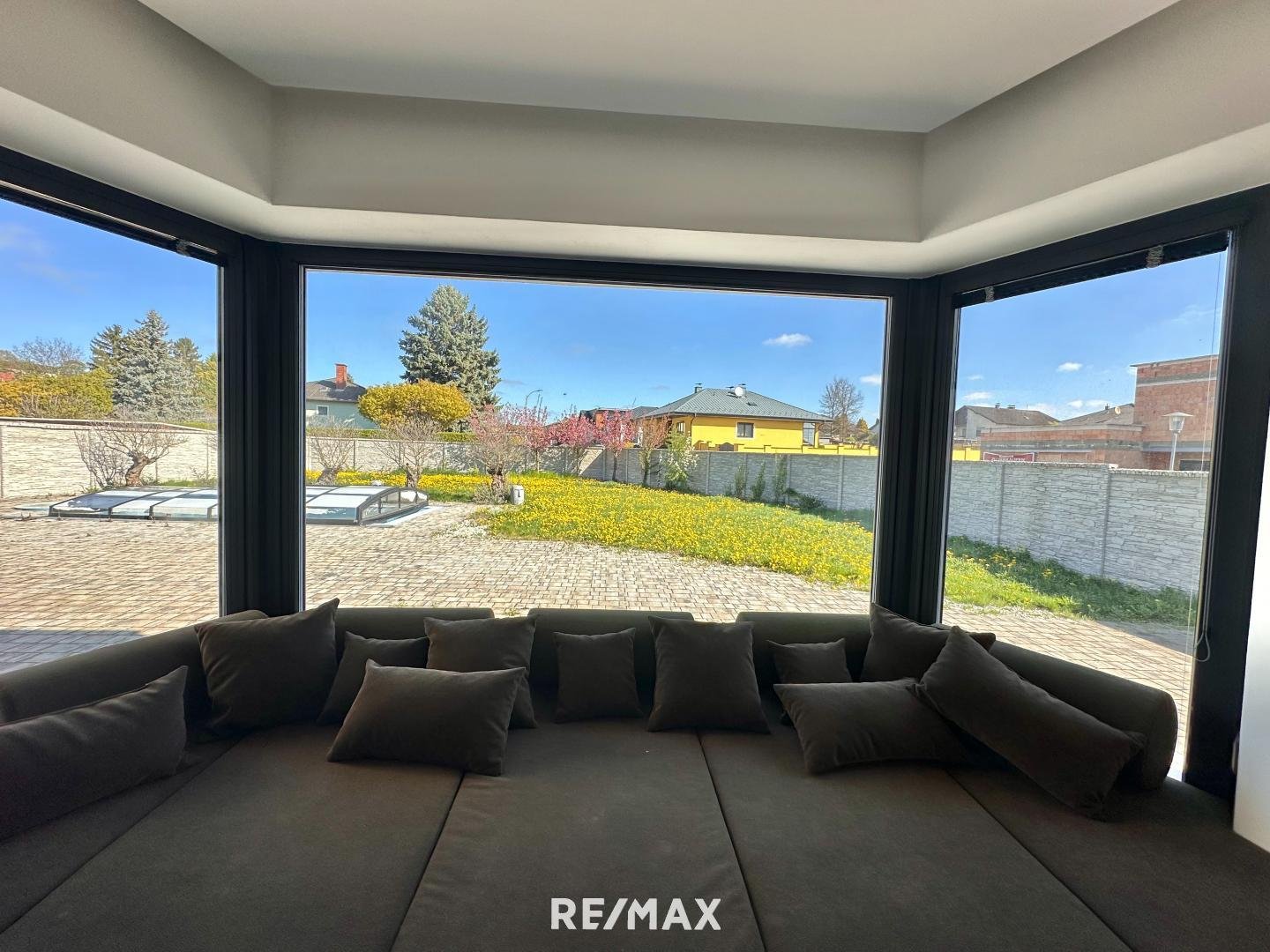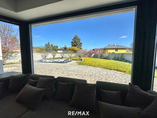 Das Herzstück des Hauses bildet das großzügige Wohnzimmer mit einer gemütlichen Leseecke, welche einen herrlichen Blick auf den gepflegten Garten und Pool bietet.