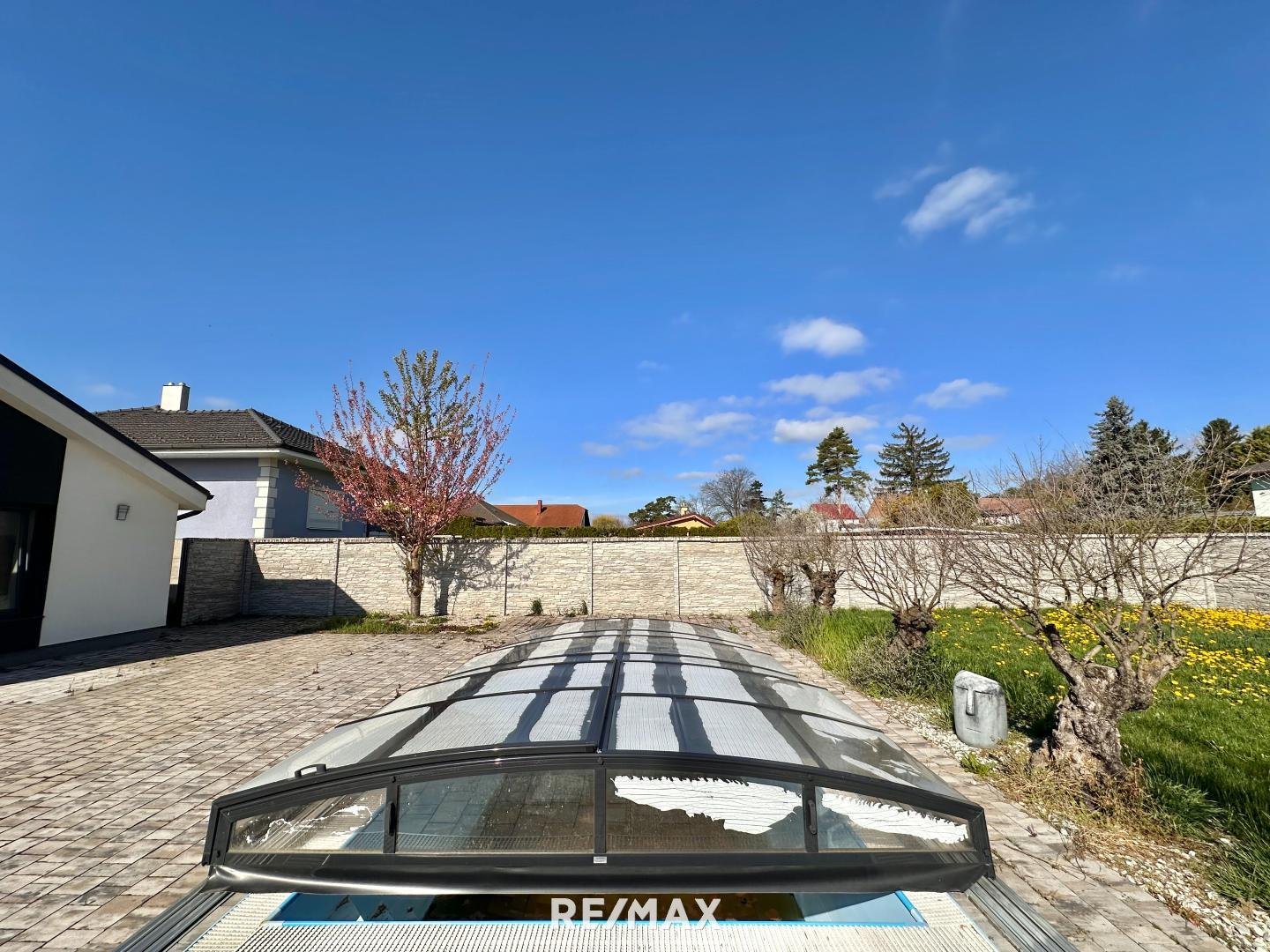 Der Swimmingpool mit Überdachung lädt an heißen Sommertagen zum Schwimmen und Verweilen ein.