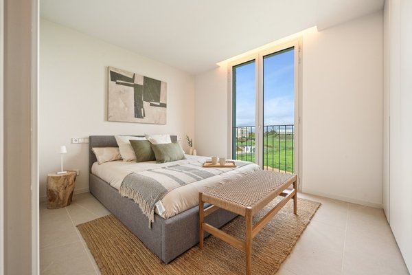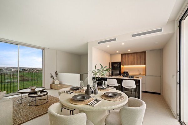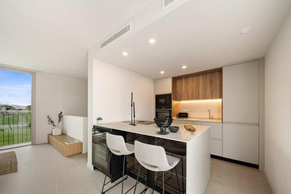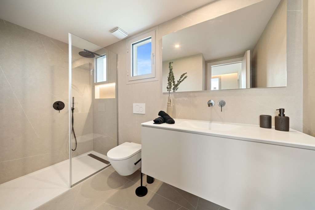 Die Wohnung geht über 2 Stockwerke und verfügt über zwei Schlafzimmer, zwei Badezimmer und besticht durch klare Linien und hochwertige Oberflächen. Porzellanbodenfliesen sind durchgehend verlegt und die offene Küche ist mit Geräten von Bosch und Bora (oder vergleichbaren) ausgestattet, die für Funktionalität und Stil sorgen. Doppelt verglaste Fenster, Fußbodenheizung, Klimaanlage (Gebläsekonvektor) und Warmwasserbereitung über eine aerothermische Anlage sorgen für ganzjährigen Komfort. Für zusätzlichen Komfort verfügt das Gebäude außerdem über einen Aufzug.