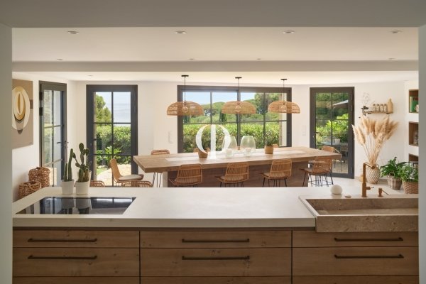 Auf den vertraulichen Höhen von Sainte-Maxime mit atemberaubendem Meerblick gelegen, verkörpert diese Villa die Kunst des Lebens am Mittelmeer. Hinter der mit behauenem Stein verzierten Fassade und dem mit alten Ziegeln patinierten Dach erstreckt sich ein Grundstück mit 365 m² Wohnfläche, eingebettet in einen üppigen Park von 2400 m². Versteckt zwischen Pinien und mediterraner Vegetation verbindet das Haus provenzalische Tradition mit zeitgenössischen Linien. Im Herzen des Gartens ragt der Swimmingpool wie ein blauer Spiegel in den Rasen hervor, umgeben von Wohnbereichen: eine schattige Terrasse für das Mittagessen im Sommer, Entspannungslounges, die in den vier Ecken des Anwesens versteckt sind, und darunter ein Bowling-Green, um den Tag ausklingen zu lassen. Im Inneren soll die Atmosphäre natürlich und beruhigend sein, getragen von einer Palette neutraler Töne und der Verwendung von Rohstoffen wie Holz und Stein, für eine diskrete und raffinierte Eleganz. Das Wohnzimmer, das wahre Herz des Hauses, erstreckt sich auf natürliche Weise nach außen und sorgt für eine harmonische Kontinuität zwischen dem Innenraum und der Landschaft, mit dem beruhigenden Blau des Swimmingpools und des Meeres im Hintergrund. Der harmonisch verteilte Schlafbereich umfasst eine Master-Suite mit Blick auf das Meer, zwei Schlafzimmer mit eigenem Bad sowie einen Raum für die Gäste, darunter zwei weitere Suiten, die um ein Wohnzimmer und einen Küchenbereich angeordnet sind und allen Unabhängigkeit und Komfort bieten. Nur wenige Minuten von den Stränden und dem Zentrum von Sainte-Maxime entfernt, eine vertrauliche Adresse mit Blick auf das Meer, für diejenigen, die eine Ausnahme in der Einfachheit suchen.