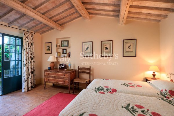 Das Haupthaus erstreckt sich über zwei Etagen: Im Erdgeschoss befinden sich eine großzügige Küche, ein Esszimmer mit direktem Zugang zur Terrasse, ein Wohnzimmer mit Kamin sowie ein Gäste-WC. Im Obergeschoss finden sich drei komfortable Doppelzimmer - jedes mit eigenem Bad - sowie ein gemütlicher Wohnbereich mit Terrasse. Die Schlafzimmer sind hell und geschmackvoll im klassischen toskanischen Stil eingerichtet.