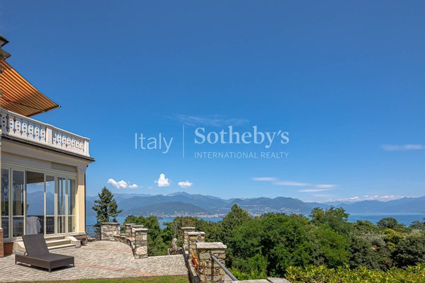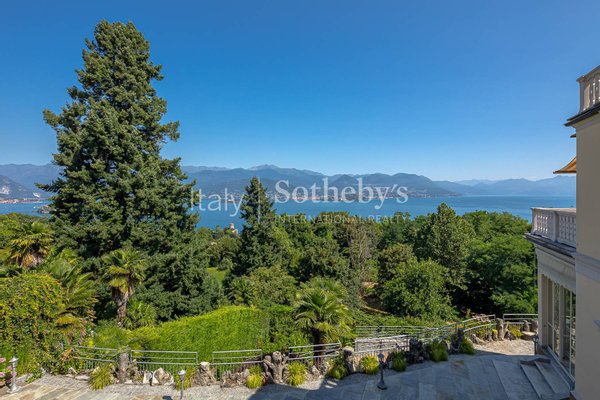 Die dominante Lage bietet spektakuläre Ausblicke auf die Borromäischen Inseln und den See, die von jedem Zimmer aus genossen werden können. Der Eingang aus Gold und Onyx führt in ein großzügiges Wohnzimmer mit Kamin und eine Terrasse mit Blick auf den gepflegten Privatpark.