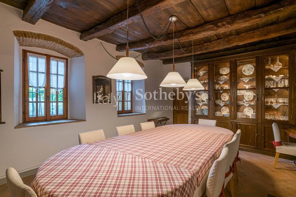 Das Landhaus zeichnet sich durch einen typischen L-förmigen Grundriss aus und öffnet sich zu einem malerischen Innenhof mit einer romantischen Pergola - perfekt für gesellige Momente im Freien. Im Inneren führt ein Eingangsbereich direkt in die großzügige Wohnküche und weiter in den großen Speisesaal mit Kamin. Im ersten Stock befindet sich ein heller Wohnbereich mit Sofaecke, Billardtisch und Bar. Die Schlafräume liegen im zweiten Obergeschoss und umfassen sechs Schlafzimmer und drei Badezimmer.