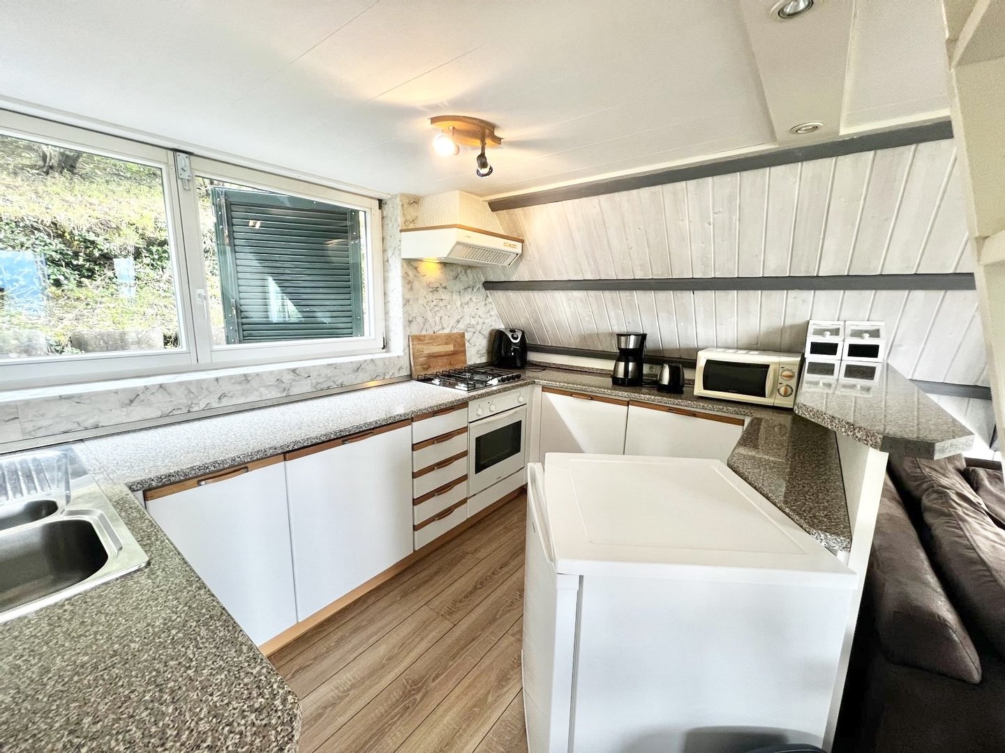 Die Wohnnutzfläche beträgt ca. 80 qm und teilt sich wie folgt auf: EG: Wohn-/Esszimmer mit direktem Zugang auf die Terrasse, offene Küche und ein Bad. OG: Schlafzimmer mit 4 Betten. Das Grundstück hat eine Größe von ca. 320 qm.
