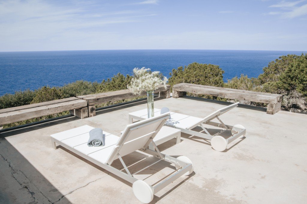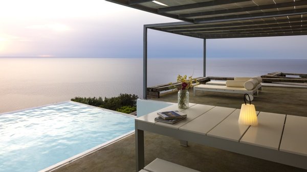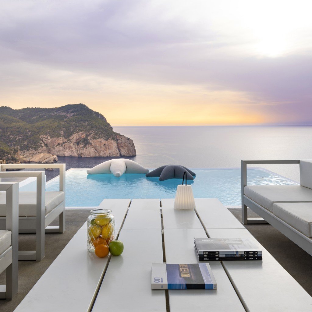 Großzügige Terrassen, ein Infinity-Pool und offene Wohnbereiche bieten einen atemberaubenden Blick auf die Landschaft Ibizas, wobei jedes Zimmer so positioniert ist, dass man unvergessliche Sonnenuntergänge genießen kann.