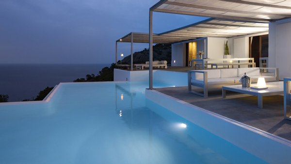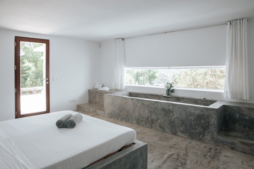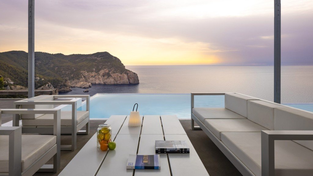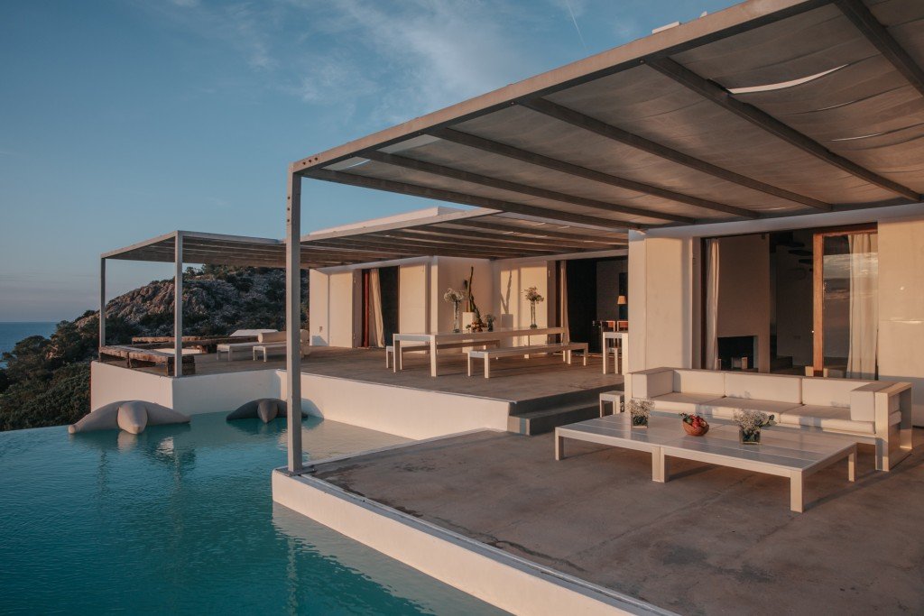Großzügige Terrassen, ein Infinity-Pool und offene Wohnbereiche bieten einen atemberaubenden Blick auf die Landschaft Ibizas, wobei jedes Zimmer so positioniert ist, dass man unvergessliche Sonnenuntergänge genießen kann.