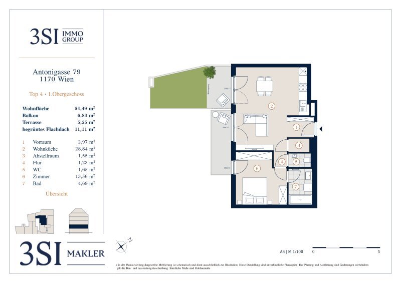 Diese moderne Wohnung verfügt über ca. 54 m² Wohnfläche, ca. 16 m² Terrasse/Balkon und ca. 11 m² begrüntes Flachdach. Sie besticht durch ihren durchdachten Grundriss und teilt sich wie folgt auf: