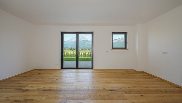 Der ca. 32 m² große Wohn-Ess-Kochbereich überzeugt vor allem durch die großen Glasfronten und den damit verbunden Ausblick auf den Wilden Kaiser.