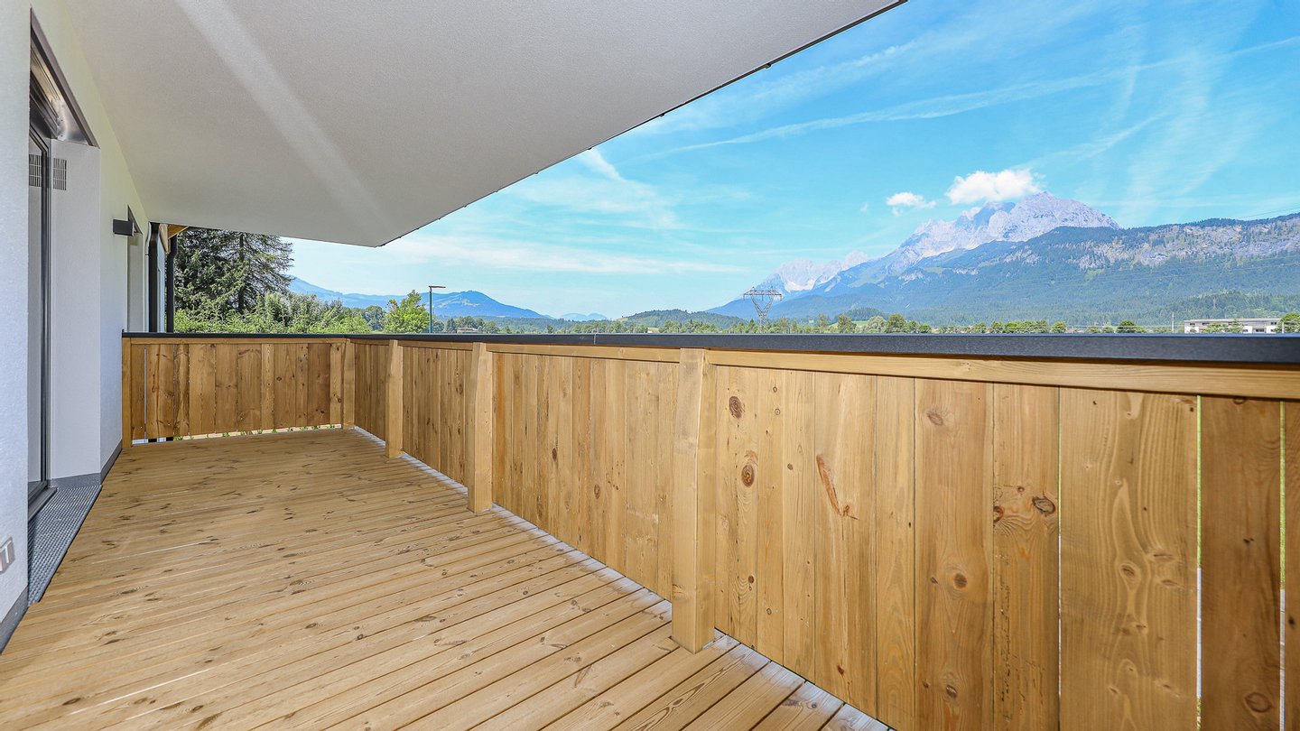 Der großzügige Wohn-Ess-Kochbereich überzeugt vor allem durch die großen Glasfronten und den damit verbunden Fernblick auf den Wilden Kaiser.