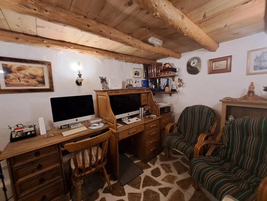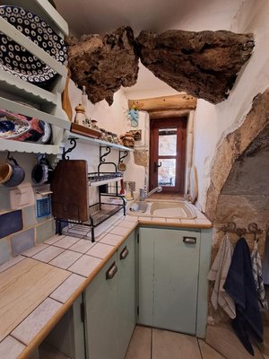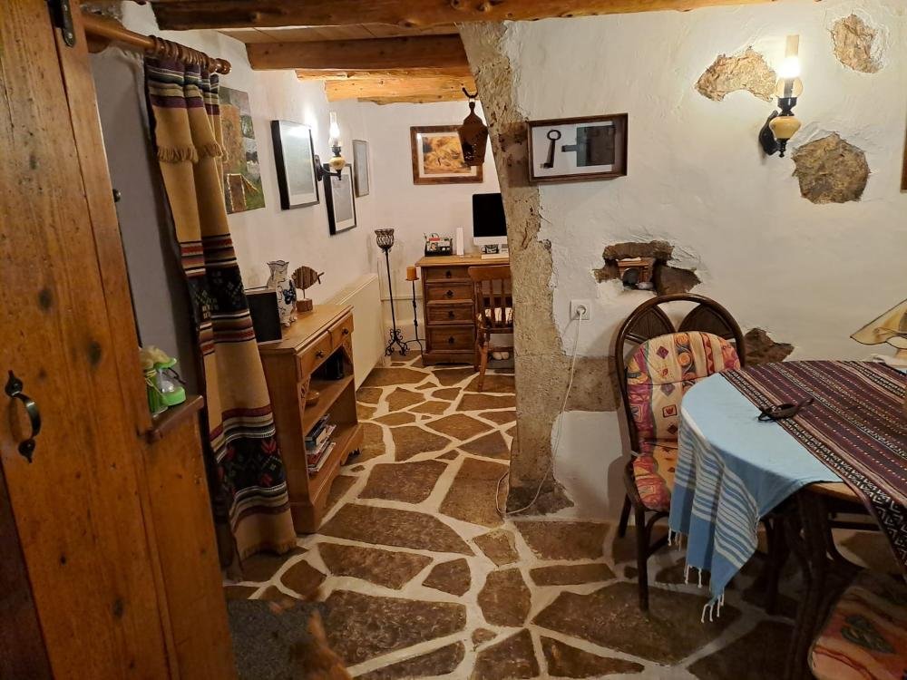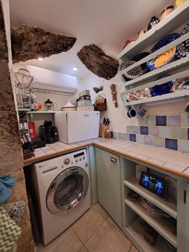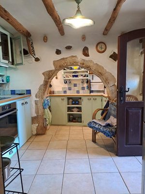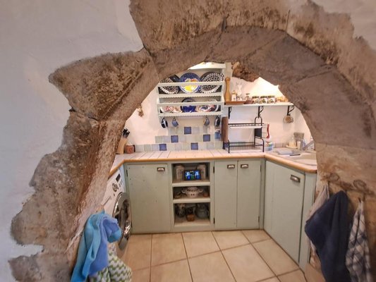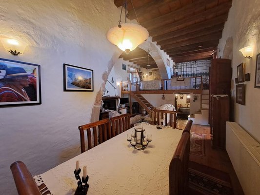 Das Anwesen ist von hohen Mauern umgeben, die Privatsphäre bieten und einen hofartigen Außenbereich bieten, der ideal zum Entspannen oder für die Unterhaltung ist. Das Haupthaus hat einen L-förmigen Grundriss mit flexiblen Wohnbereichen. Es verfügt über eine voll ausgestattete Küche mit der originalen Ofennische, einen Essbereich, eine Büroecke und ein Wohnzimmer mit doppelter Deckenhöhe, ein Schlafzimmer im Zwischengeschoss und ein erhöhtes Badezimmer. Das Design verbindet traditionelle Elemente mit modernem Komfort.