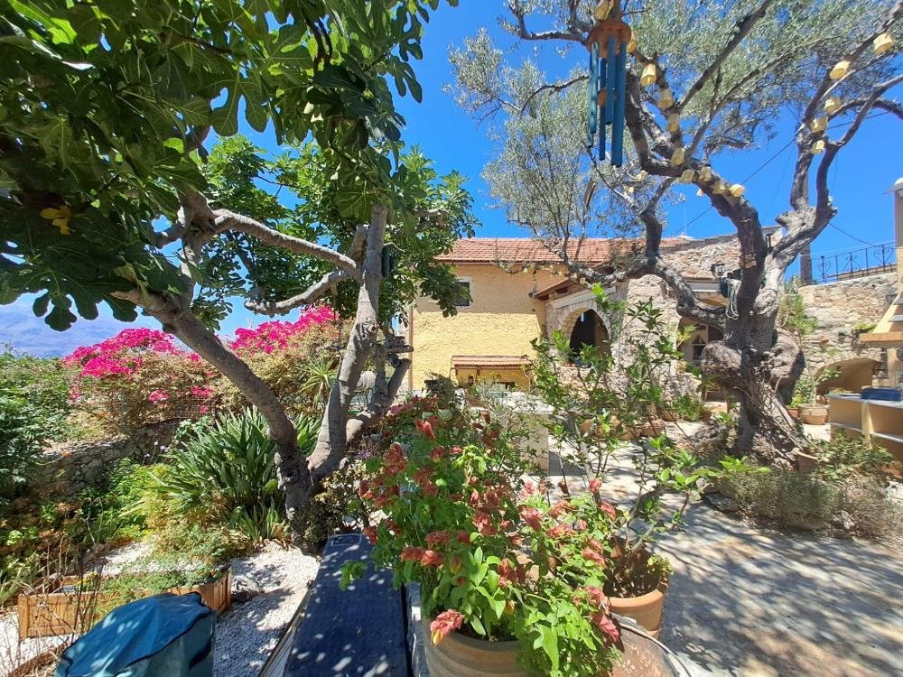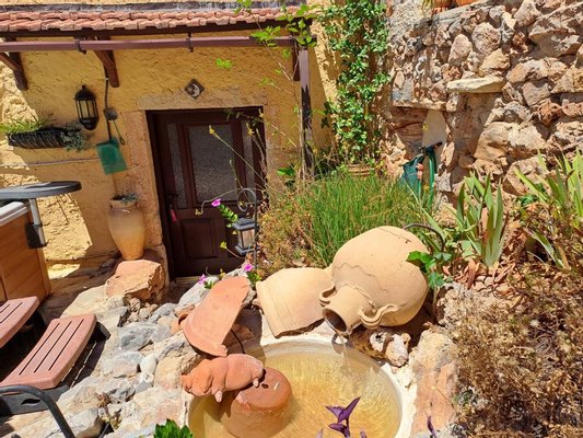 Der Garten ist gepflegt und bietet eine Vielzahl von Pflanzen, schattige Sitzbereiche, einen Steingrill, einen Whirlpool und eine große überdachte Terrasse für Mahlzeiten im Freien. Eine Treppe führt zu einer Dachterrasse mit freiem Blick auf das Dorf und die nahen Berge.