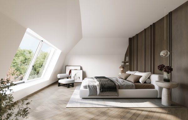 Ein Highlight der Mehrfamilienvilla ist das Penthouse über zwei Ebenen mit großem Atelier und Dachterrasse, die einen beeindruckenden Blick über die Dächer von Nymphenburg bis zum historischen Schloss Nymphenburg bietet.