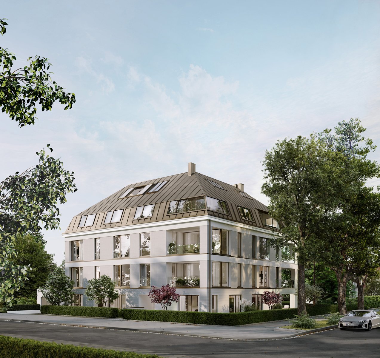 Das großzügige Eckgrundstück mit perfekter Süd-West-Ausrichtung ist nur wenige Gehminuten vom angrenzenden Schlossensemble entfernt. Die elegante Mehrfamilienvilla umfasst lediglich sieben Wohneinheiten, die den Blick ins Grüne maximieren und die Natur in die Räume holen.