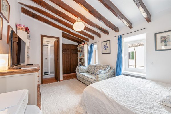 Im obersten Stockwerk bietet ein drittes Zimmer mit eigenem WC einen atemberaubenden Blick auf den Calvario und die Tramuntana-Berge und ist somit der perfekte Ort für ein Heimbüro oder einen kreativen Raum.