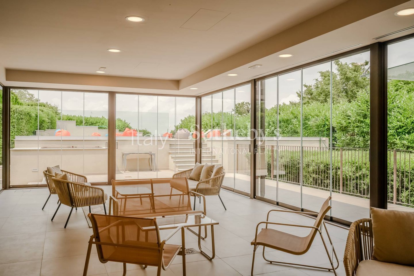 Im Außenbereich rahmt ein panoramischer Garten den herrlichen Pool mit Sonnenterrasse ein, von dem aus sich ein unvergleichlicher Blick auf die gesamte Alpenkette eröffnet.