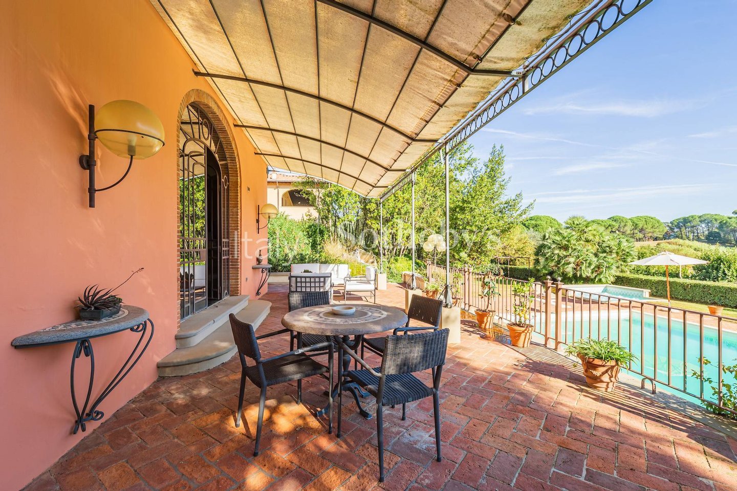 Eine herrliche Panoramaterrasse, Veranden mit Blick auf den Garten und überdachte Außenbereiche vervollständigen die Harmonie zwischen Architektur und Landschaft. Ideal zum ganzjährigen Wohnen oder als repräsentativer Wohnsitz - das Anwesen vereint authentischen toskanischen Stil mit modernem Komfort auf höchstem Niveau.
