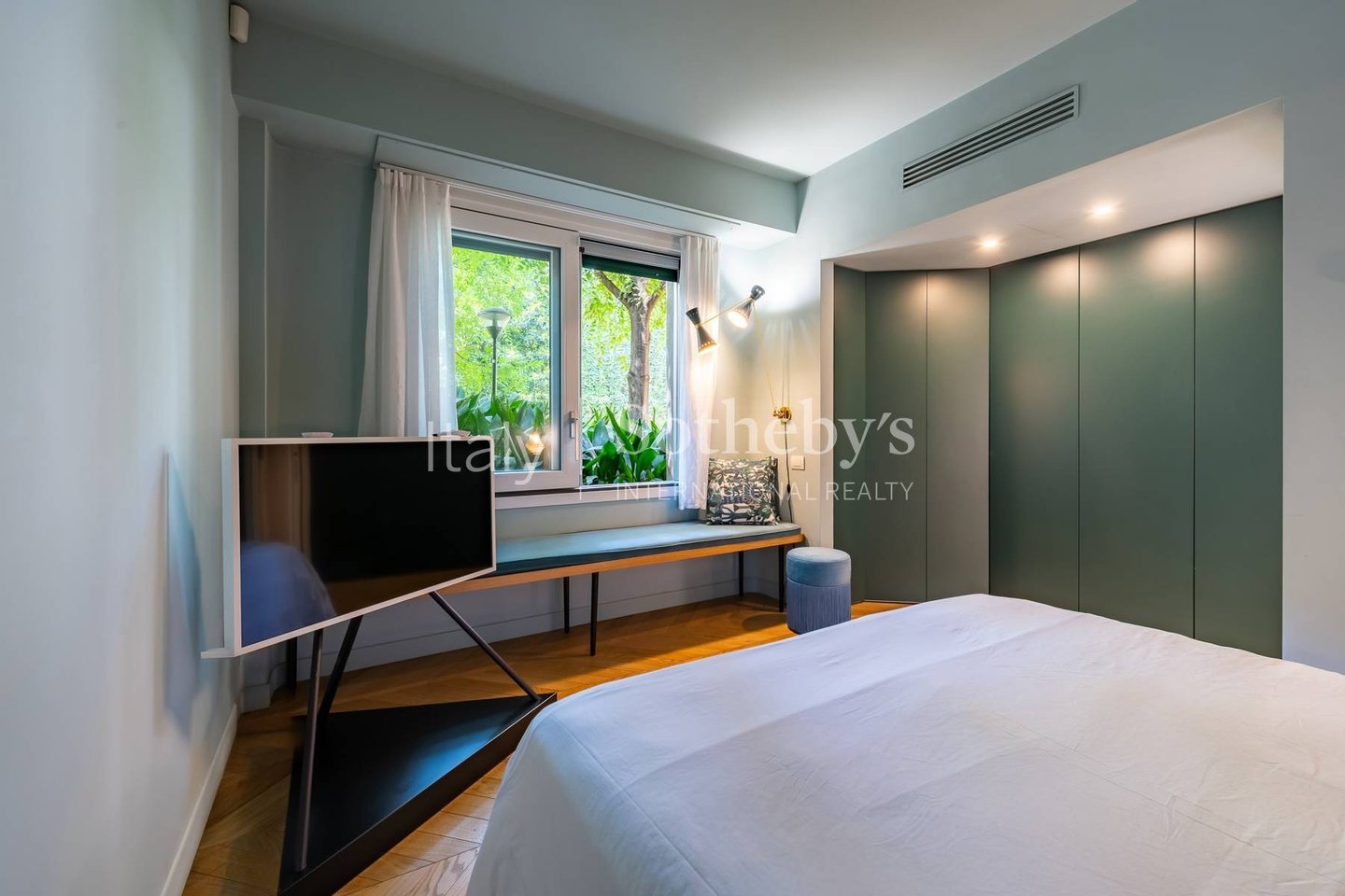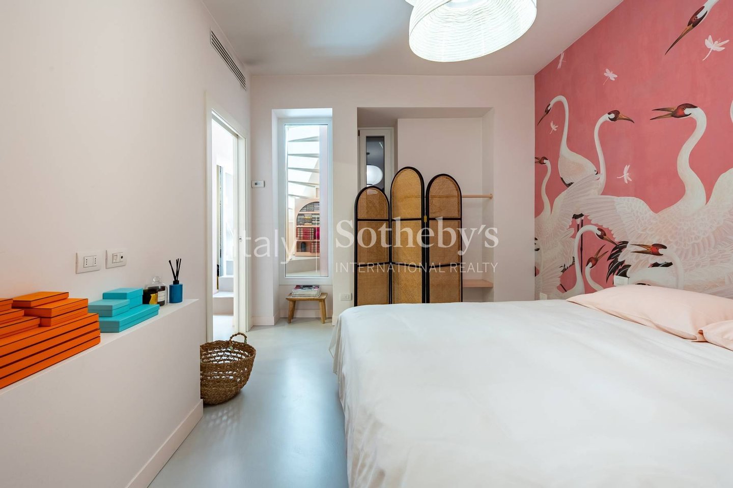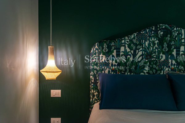 Das Untergeschoss (ca. 70 m²) ist über eine Treppe zugänglich, die als vertikaler Lichtschacht entlang des Innenhofs gestaltet ist. Es beherbergt ein zweites großes Doppelzimmer, ein weiteres Badezimmer mit passenden hochwertigen Ausstattungen, einen großzügigen begehbaren Kleiderschrank - der problemlos als Heimfitnessraum genutzt werden kann - sowie einen Wäschebereich mit dramatischen Gewölbedetails und edlen Samtvorhängen.