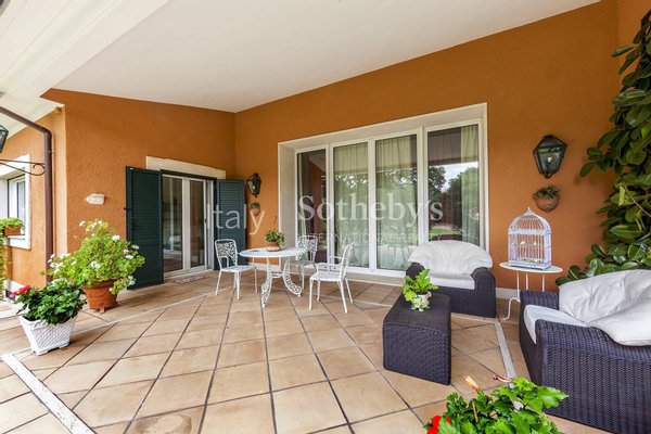Die Außenbereiche bilden eine natürliche Erweiterung der Villa: eine beeindruckende, möblierte Veranda, ruhige Lounge-Ecken mit stilvollen Sofas im Grünen und ein traumhafter Pool mit Terrakotta-Solarium schaffen eine Atmosphäre voller Charme und Wohlbefinden - ideal zum Empfangen von Gästen oder zum privaten Genießen der römischen Dolce Vita.