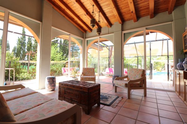 Die Hauptvilla besteht aus einem schönen Eingangsbereich, einem Flur, einer offenen, voll ausgestatteten Küche in Familiengröße mit Halbinsel und hochwertigen Schränken und Haushaltsgeräten, einem Esszimmer, das sich perfekt für Partys eignet und mehrere Doppeltüren zum Wintergarten und zur großen offenen Terrasse/Veranda hat, einem großen, gemütlichen Wohnzimmer, derzeit drei Schlafzimmern, das Hauptschlafzimmer mit eigenem Bad, einem Büro (oder einem vierten Schlafzimmer), einem separaten Schlafzimmer im ersten Stock, das über eine Wendeltreppe vom zweiten Innenhof aus zu erreichen ist, einem Familienduschraum und einer Garderobe. Von der Veranda aus hat man einen herrlichen Blick auf den privaten Swimmingpool, den Garten, die Berge und die umliegende Landschaft!
