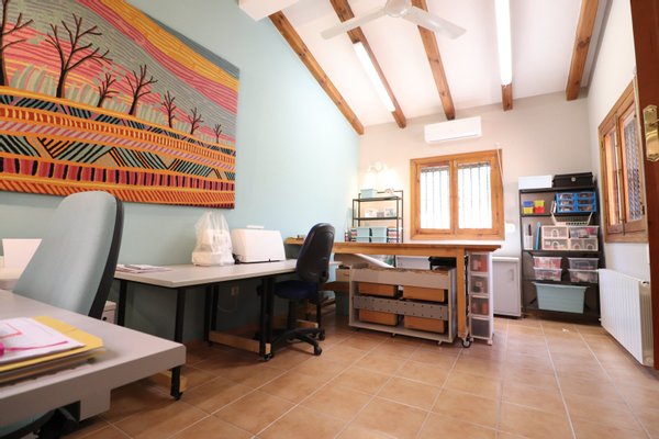 Es gibt eine Garage, die derzeit in eine Kunstwerkstatt umgewandelt wurde, mit Küchenzeile und Duschraum.
